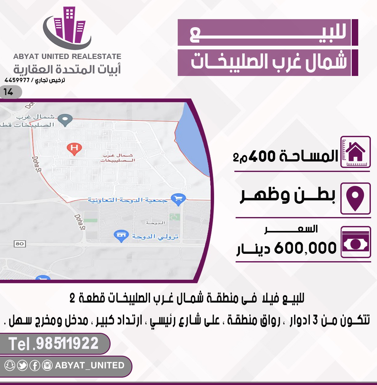 فيلا للبيع فى شمال غرب الصليبيخات Share ملخص للبيع فيلا فى منطقة شمال غرب الصليبخات ، قطعة 2 ، تقع على بطن وظهر ، المساحة 400 متر مربع ، تتكون من 3 ادوار ، رواق منطقة ، على شارع رئيسي ، ارتداد كبير ، مدخل ومخرج سهل . للاستفسار. النقال 1 98511922 ، السعر 600 ألف دينار التفاصيل Page Views الأماكن القريبة من جوجل Close