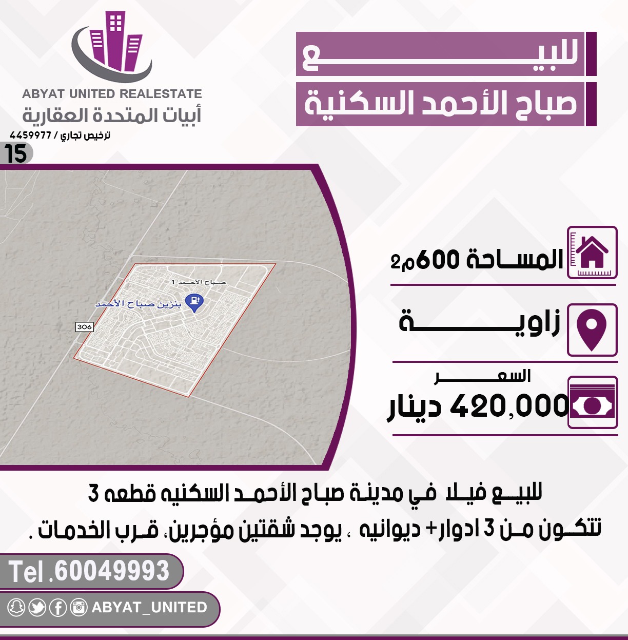 فيلا للبيع فى صباح الاحمد السكنية Share ملخص للبيع فيلا في مدينة صباح الاحمد السكنيه قطعه 3 ، الموقع زاويه ،المساحة 600 متر مربع ، تتكون من 3 ادوار ، ديوانيه ، يوجد شقتين مؤجرين ، قرب الخدمات ، للاستفسار النقال 1 60049993 ، السعر 420 ألف دينار ، الكود 15 التفاصيل Page Views الأماكن القريبة من جوجل Close