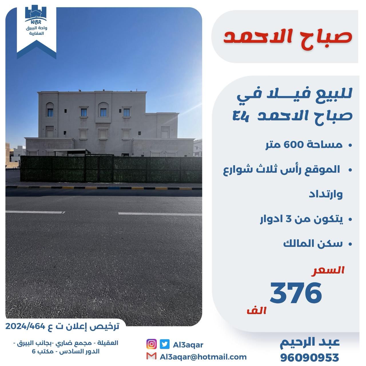 فيلا للبيع فى صباح الاحمد السكنية Share ملخص للبيع فيلا في صباح الاحمد E 4 ، مساحتها 600 متر مربع ، الموقع رأس ثلاث شوارع وارتداد ، يتكون من 3 ادوار سكن المالك السعر 376 ألف د.ك التفاصيل Page Views الأماكن القريبة من جوجل Close