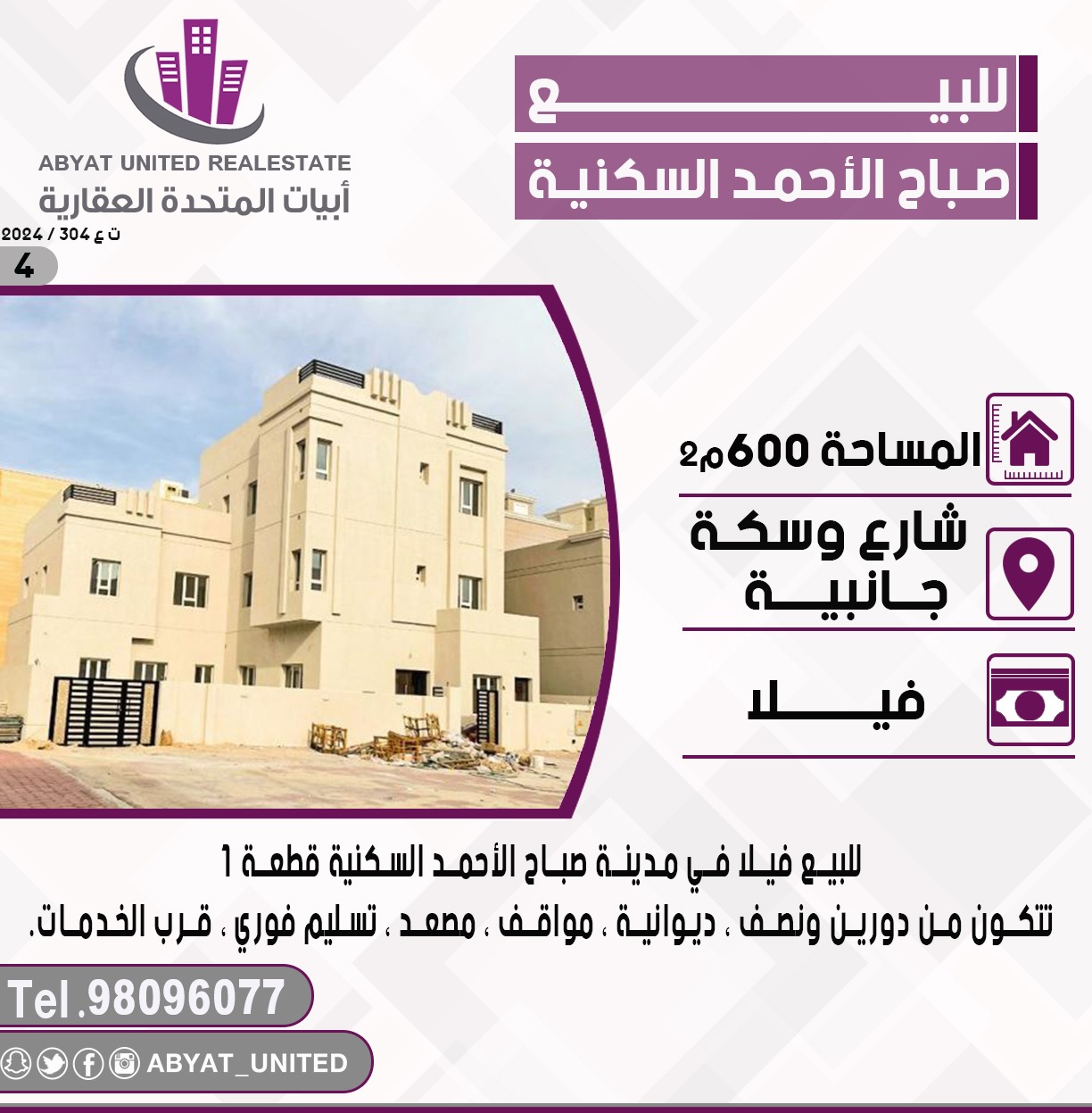 للبيع فيلا فى مدينة صباح الاحمد السكنية قطعه1 ، الموقع شارع وسكة جانبية ، المساحة 600 متر مربع ، تتكون من دورين ونصف ، ديوانية ، مواقف ، مصعد ، تسليم فوري، قرب الخدمات . للاستفسار ، النقال 1