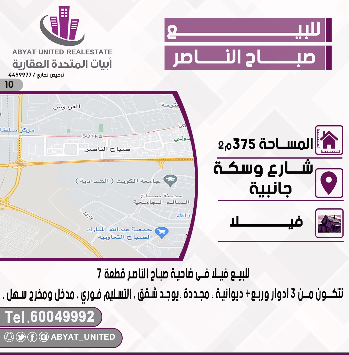 للبيع فيلا فى ضاحية صباح الناصر ، قطعة 7 ، المساحة 375 متر مربع ، تتكون من 3 ادوار وربع ، ديوانية ، مجدد ، يوجد شقق ، التسليم فوري ، مدخل ومخرج سهل ، النقال 1 ، 60049992