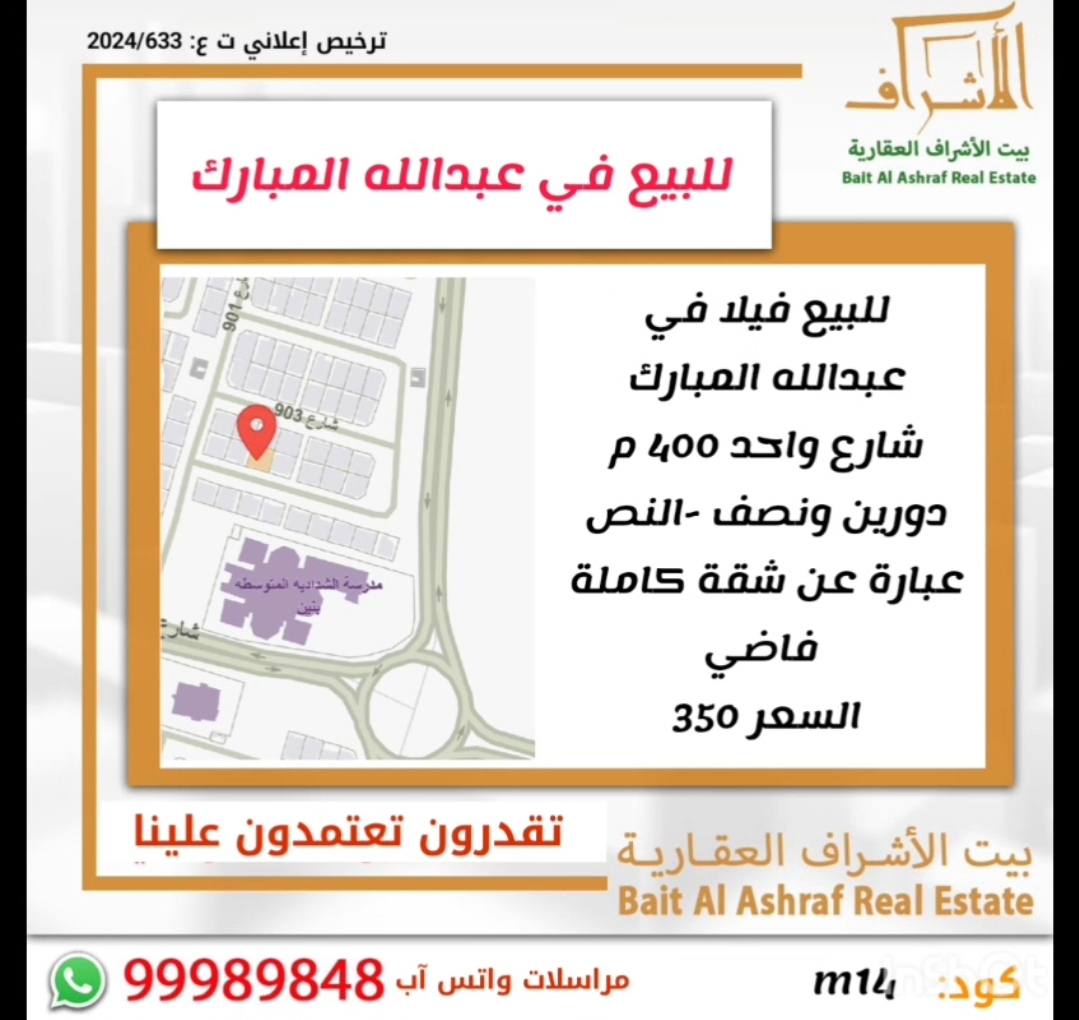 فيلا للبيع فى عبدالله المبارك Share ملخص فيلا للبيع فى عبدالله المبارك ، تقع على شارع واحد ، مساحتها 400 متر مربع , تتكون من دورين ونصف ، النصف عباره عن شقه كامله فاضيه ، السعر 350 ألف د.ك ، كود m 14 , مراسلات وتساب 99989848 , ترخيص اعلان 633 .2024 التفاصيل حالة: للبيع Page Views الأماكن القريبة من جوجل خصائص ذات صلة للبيع تجربة عنصر للبيع abdulrahman منذ 3 أسابيع للبيع د.ك111111 شقة تجربة عقار جديد خليل بوست أسرة: 666666 الحمامات: 666666 admin منذ 4 أسابيع Close
