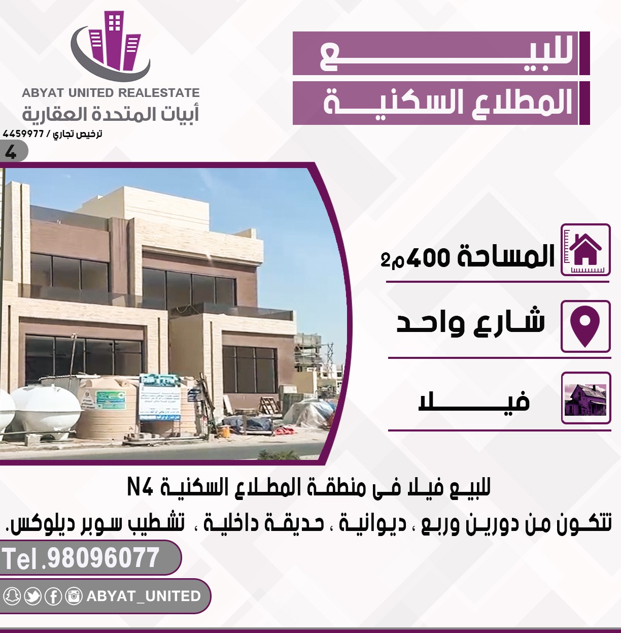 فيلا للبيع فى مدينة المطلاع السكنية Share ملخص للبيع فيلا في مدينة المطلاع السكنية N4 ، تقع على زاوية ، مساحتها 400 متر مربع ، تتكون من دورين وربع ، ديوانية ، حديقة داخليه. تشطيب سوبر ديلوكس ، للاستفسار النقال 1 98096077 التفاصيل Page Views الأماكن القريبة من جوجل Close