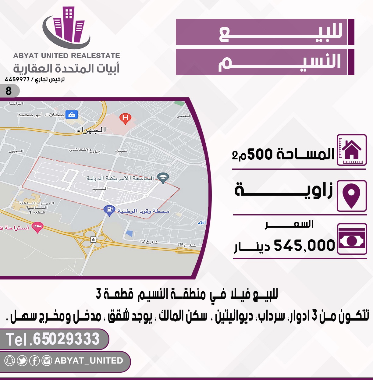 فيلا للبيع فى منطقة النسيم زاوية Share ملخص للبيع فيلا في منطقه النسيم ، قطعه 3 ، تقع على زاويه ، مساحتها 500 متر مربع ، تتكون من 3 ادوار ، سرداب ، ديوانيتين ، يوجد شقق ،مدخل ومخرج سهل ، للاستفسار ، النقال 1 ، 65029333 ، السعر 545 الف د.ك ، كود 8 التفاصيل حالة: للبيع Page Views الأماكن القريبة من جوجل خصائص ذات صلة للبيع تجربة عنصر للبيع abdulrahman منذ 3 أسابيع للبيع د.ك111111 شقة تجربة عقار جديد خليل بوست أسرة: 666666 الحمامات: 666666 admin منذ 4 أسابيع Close