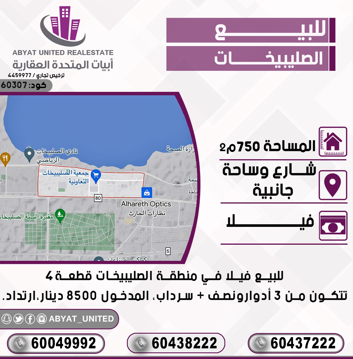 للبيع فيلا في منطقة الصليبخات قطعة 4 ، الموقع شارع وساحة جانبية ، مساحتها 750 متر مربع ، تتكون من 3 ادوار ونصف ، سرداب ، المدخول 8500 دينار ، ارتداد . للاستفسار النقال 1 60437222 ، النقال 2 60438222 ، النقال 3 60049992 ، الكود 60307