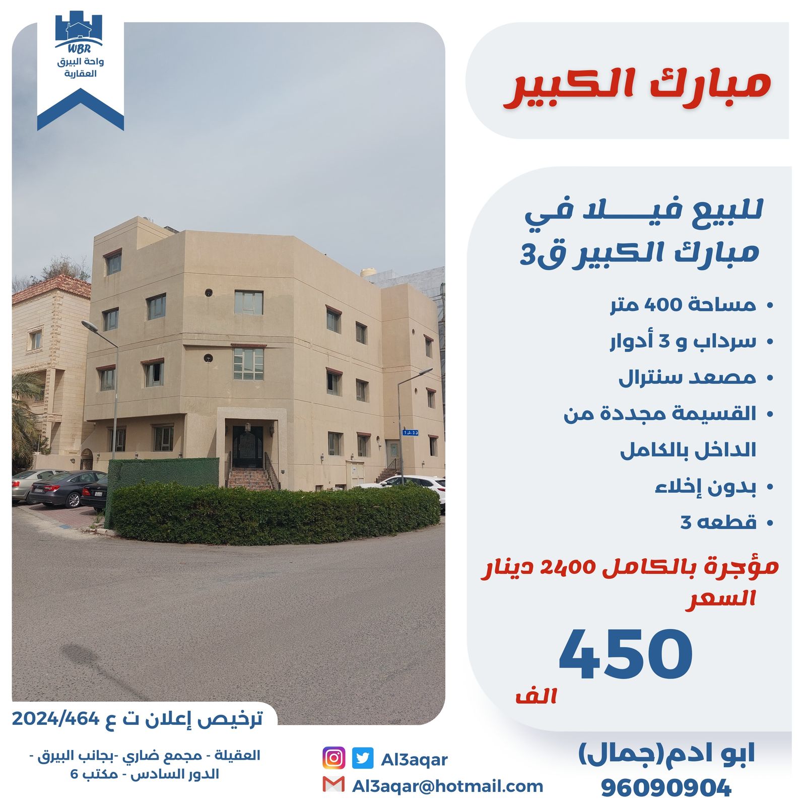فيلا مؤجره للبيع فى مبارك الكبير Share ملخص للبيع فيلا في مبارك الكبير ، قطعه 3 ، تتكون من سرداب و 3 أدوار ، مصعد سنترال ، القسيمة مجددة من الداخل بالكامل ، مؤجرة بالكامل 2400 دينار ، بدون إخلاء ، سعر البيع 450 ألف د.ك. التفاصيل حالة: للبيع Page Views الأماكن القريبة من جوجل خصائص ذات صلة للبيع تجربة عنصر للبيع abdulrahman منذ أسبوعين للبيع د.ك111111 شقة تجربة عقار جديد خليل بوست أسرة: 666666 الحمامات: 666666 admin منذ 4 أسابيع Close