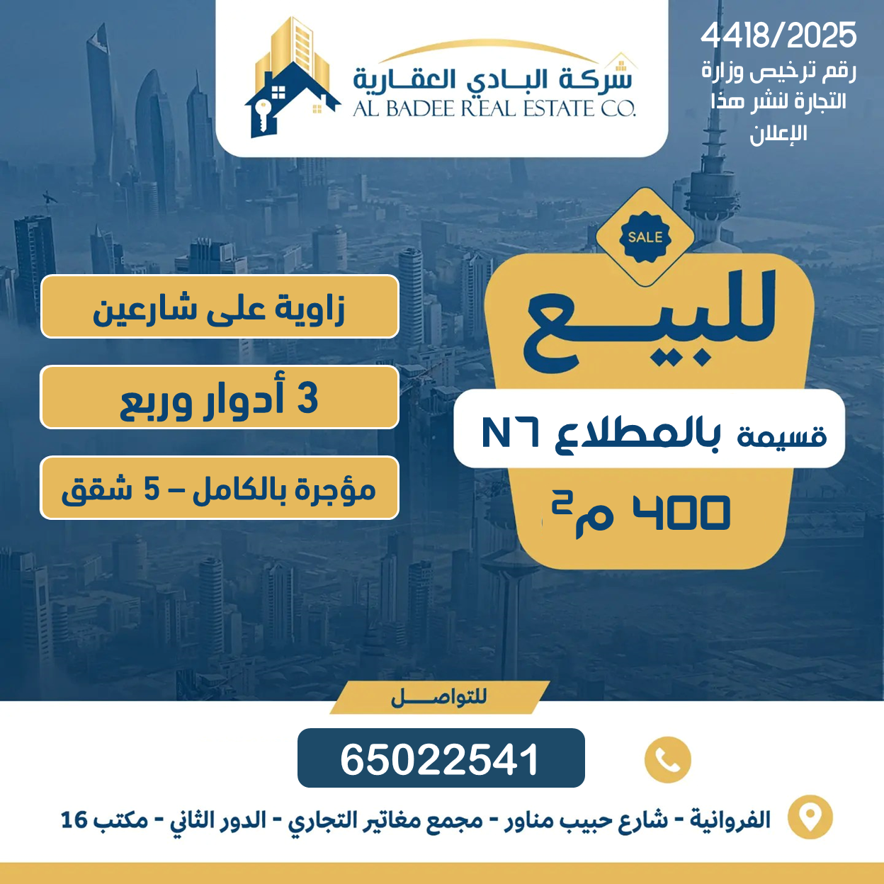 للبيع قسيمة بالمطلاع N7 ، تقع على زاوية على شارعين ، تتكون من 3 أدوار وربع ، مؤجرة بالكامل ، عبارة عن 5 شقق .