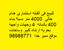 قسيمه استثمارى للبيع فى القبلة 4 واجهات Share ملخص للبيع فى القبله استثمارى ، مساحتها 4000 متر مربع ، نسبة بناء 400 بالمائه ، تقع على 4 وجهات ، واجهه بحريه ارتداد كبير وساحات موقع مميز جدا 98988771 التفاصيل حالة: للبيع Page Views الأماكن القريبة من جوجل خصائص ذات صلة للبيع تجربة عنصر للبيع abdulrahman منذ أسبوعين للبيع د.ك111111 شقة تجربة عقار جديد خليل بوست أسرة: 666666 الحمامات: 666666 admin منذ 3 أسابيع Close