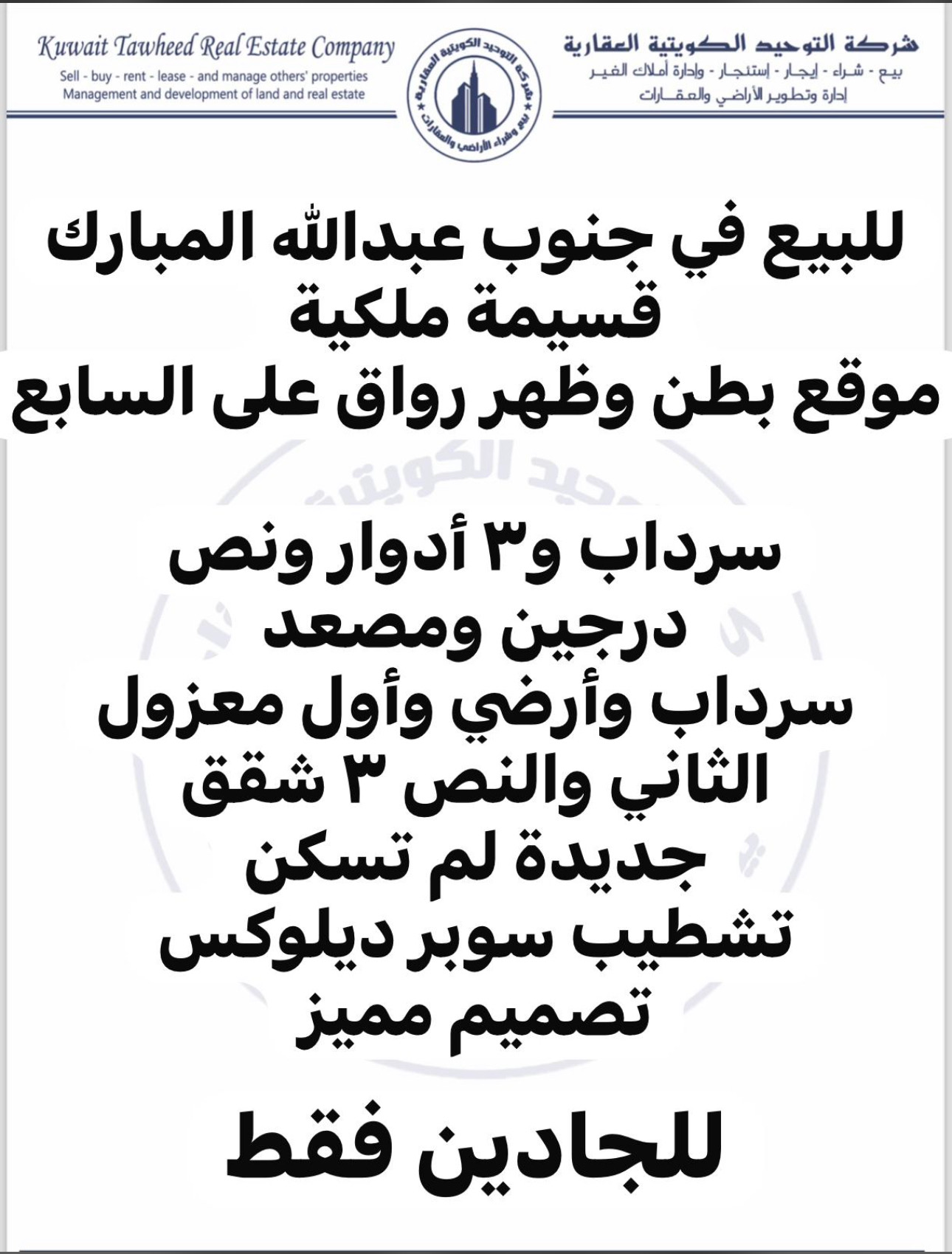 للبيع في جنوب عبدالله المبارك، قسيمة ، موقع بطن وظهر رواق منطقة على السابع، مكونة من سرداب و 3 أدوار ونص، سرداب وأرضي وأول معزول، الثاني والنص 3 شقق ، درجين ومصعد، مدخل ومخرج ممتاز، قريب للمسجد والفرع ، السعر 620 ألف د.ك صافي ، لمزيد من التفاصيل التواصل على الرقم 96902204 ، شركة التوحيد الكويتية العقارية.