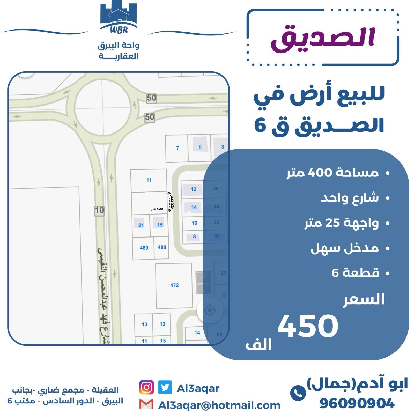 للبيع أرض فى منطقة الصديق قطعة 6 Share ملخص للبيع أرض فى الصديق قطعة 6 ، مساحتها 400 متر مربع ، تقع على شارع واحد ، واجهه 25 متر ، مدخل سهل مفروزة من قسيمة 13 السعر 450 ألف د.ك . التفاصيل حالة: للبيع Page Views الأماكن القريبة من جوجل خصائص ذات صلة للبيع تجربة عنصر للبيع abdulrahman منذ 3 أسابيع للبيع د.ك111111 شقة تجربة عقار جديد خليل بوست أسرة: 666666 الحمامات: 666666 admin منذ 4 أسابيع Close