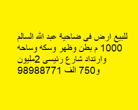 للبيع أرض موقع في ضاحية عبدالله السالم Share ملخص للبيع ارض فى ضاحية عبدالله السالم مساحتها 1000 م بطن وظهر وسكه وساحه وارتداد شارع رئيسى ، السعر 2 مليون و 750 الف . للتواصل 98988771 التفاصيل حالة: للبيع Page Views الأماكن القريبة من جوجل خصائص ذات صلة للبيع تجربة عنصر للبيع abdulrahman منذ 3 أسابيع للبيع د.ك111111 شقة تجربة عقار جديد خليل بوست أسرة: 666666 الحمامات: 666666 admin منذ 4 أسابيع Close