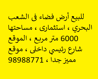 للبيع ارض فضاء فى الشعب استثماريه Share ملخص للبيع أرض فضاء فى الشعب البحري ، استثمارى ، مساحتها 6000 متر مربع ، الموقع شارع رئيسي داخلى ، موقع مميز جدا ، 98988771 التفاصيل حالة: للبيع Page Views الأماكن القريبة من جوجل خصائص ذات صلة للبيع تجربة عنصر للبيع abdulrahman منذ أسبوعين للبيع د.ك111111 شقة تجربة عقار جديد خليل بوست أسرة: 666666 الحمامات: 666666 admin منذ 3 أسابيع Close