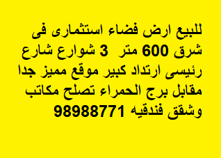 للبيع ارض فضاء فى شرق استثماريه Share ملخص للبيع أرض فضاء استثماري فى شرق ، مساحتها 600 متر مربع ، تقع على 3 شوارع ، شارع رئيسي ، ارتداد كبير ، موقع مميز جدا ، مقابل برج الحمراء ، تصلح مكاتب وشقق فندقية التفاصيل حالة: للبيع Page Views الأماكن القريبة من جوجل خصائص ذات صلة للبيع تجربة عنصر للبيع abdulrahman منذ أسبوعين للبيع د.ك111111 شقة تجربة عقار جديد خليل بوست أسرة: 666666 الحمامات: 666666 admin منذ 3 أسابيع Close