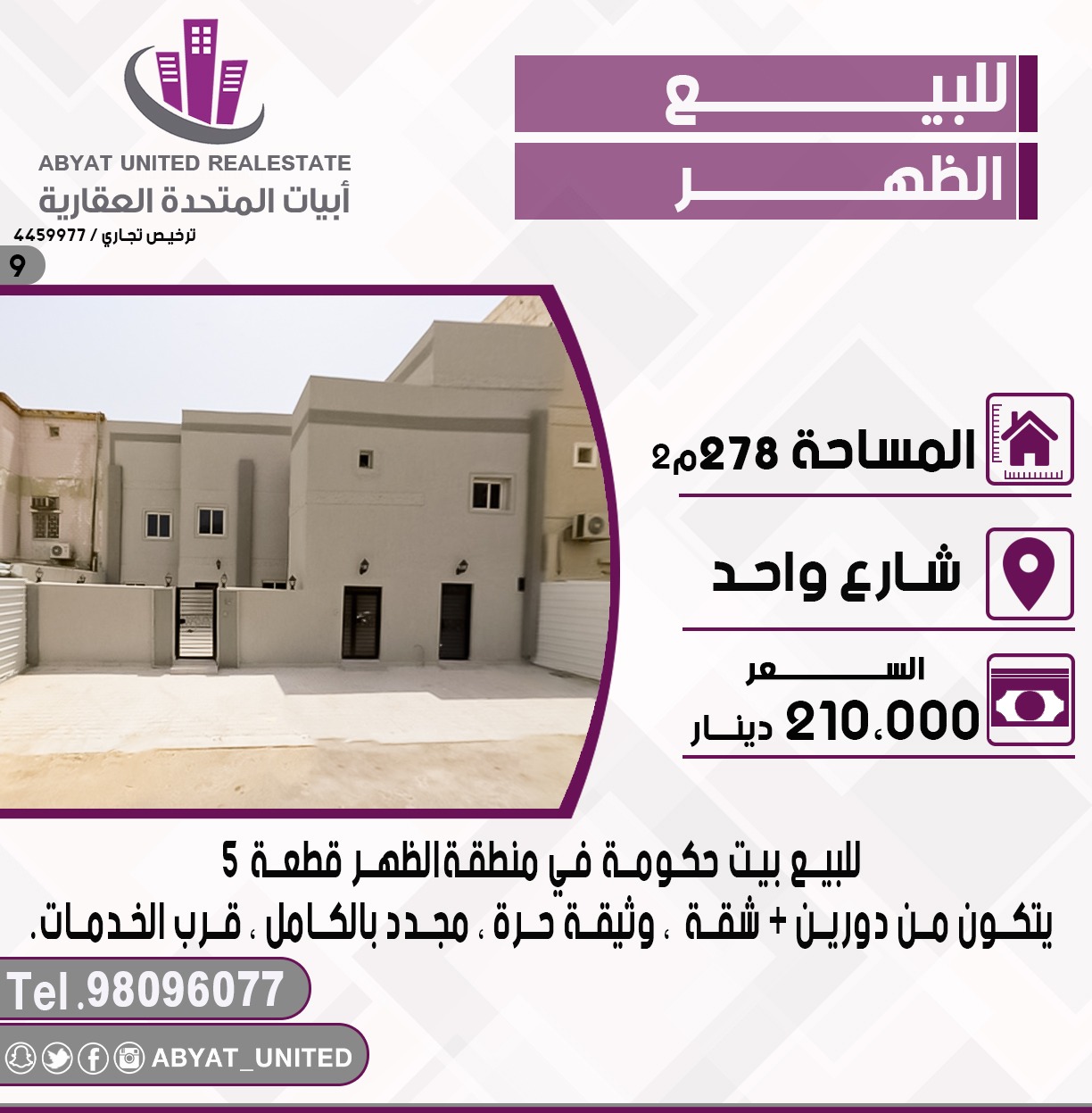 للبيع بيت حكومة فى الظهر Share ملخص للبيع بيت حكومة فى منطقة الظهر قطعه 5 ، الموقع شارع واحد ، المساحة 278 متر مربع ، يتكون من دورين ، شقه ، وثيقه حرة ، مجدد بالكامل ، قرب الخدمات ، للاستفسار النقال 1 98096077 ، السعر 210 ألف د.ك ، الكود 4 التفاصيل حالة: للبيع Page Views الأماكن القريبة من جوجل خصائص ذات صلة للبيع للايجار فيلا فى مدينة صباح الأحمد admin منذ شهرين للبيع للبيع أراضي فى البحرية الخامسة admin منذ شهرين Close