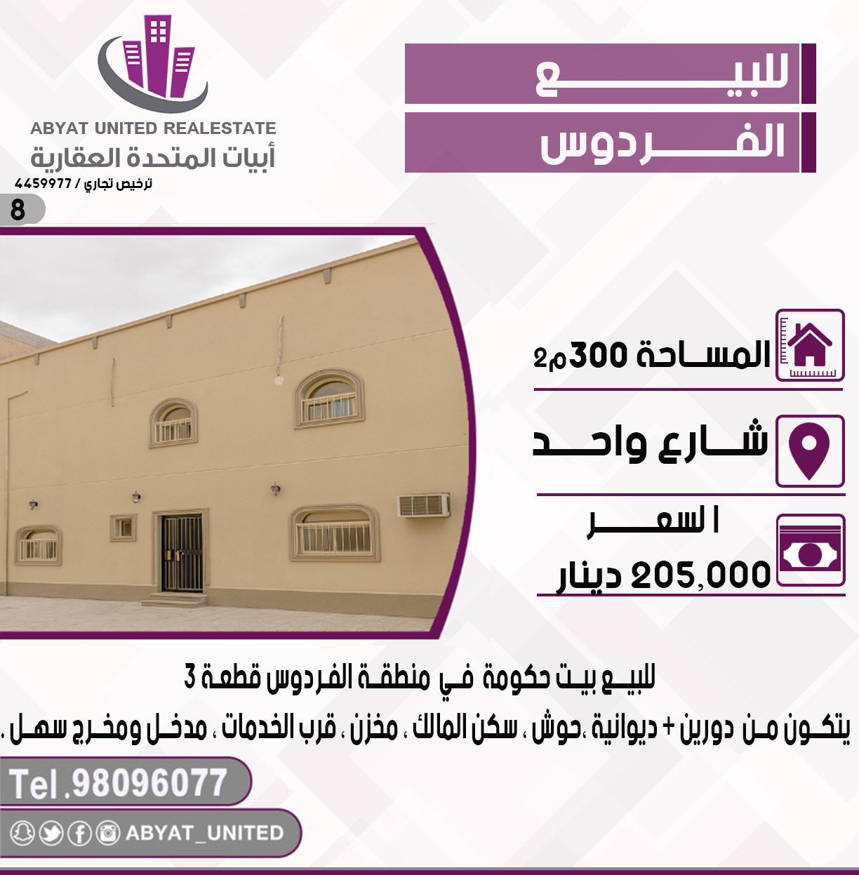 للبيع بيت حكومة فى منطقة الفردوس ، قطعه 3 ، الموقع شارع واحد ، المساحة 300 متر مربع ، يتكون من دورين , ديوانية ، حوش ، سكن المالك ، مخزن ، قرب الخدمات ، مدخل ومخرج سهل ، للاستفسار النقال 1 98096077 ، السعر 205 ألف د.ك ، الكود 4