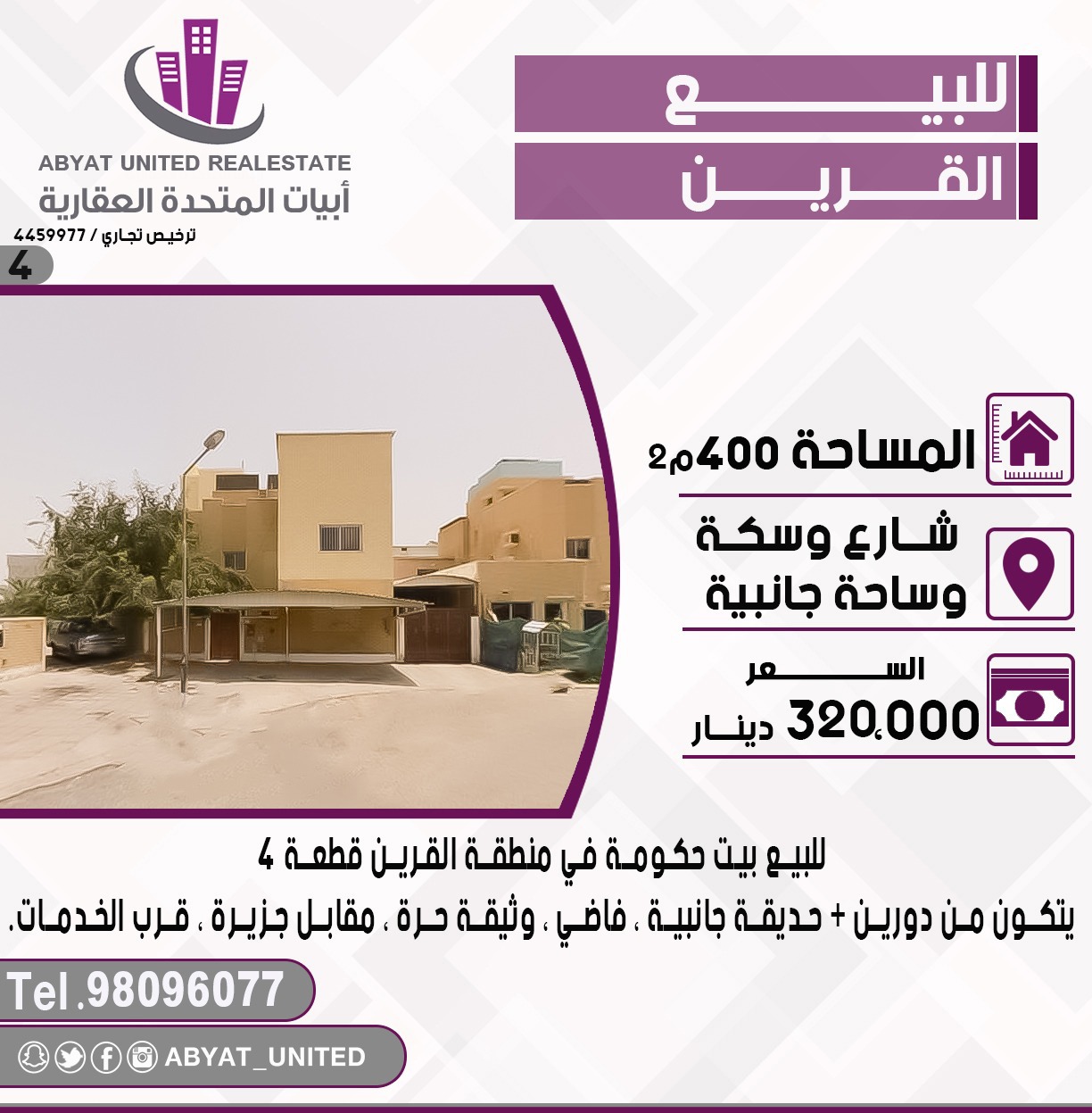 للبيع بيت حكومة فى القرين Share ملخص للبيع بيت حكومة فى منطقة القرين قطعه 4 ، الموقع شارع وسكة وساحة جانبيه ، المساحة 400 متر مربع ، يتكون من دورين ، حديقه جانبيه ، فاضي ، وثيقه حره ، مقابل جزيره ، قرب الخدمات ، للاستفسار النقال 1 98096077 ، السعر 320 ألف د.ك ، الكود 4 التفاصيل Page Views الأماكن القريبة من جوجل Close