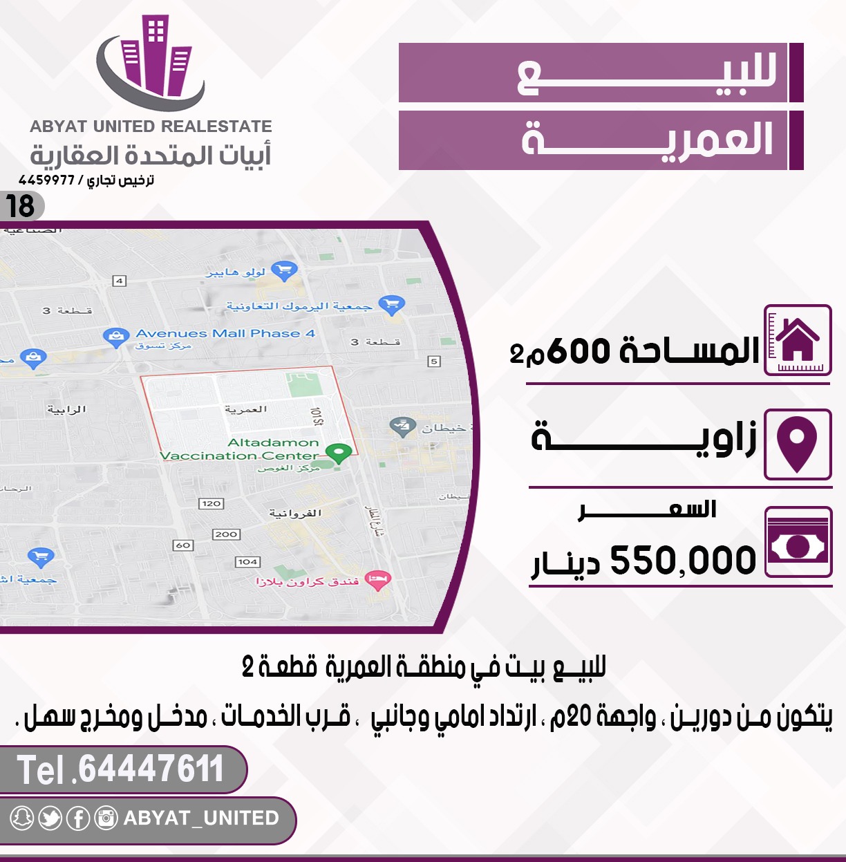 للبيع بيت فى منطقة العمرية ، الموقع زاوية ، المساحة 600 متر مربع ، يتكون من دورين ، واجهة 20 متر ، ارتداد امامي وخلفي ، قرب الخدمات ، مدخل ومخرج سهل ، للاستفسار النقال 1 64447611 ، السعر 550 ألف د.ك ، كود 18