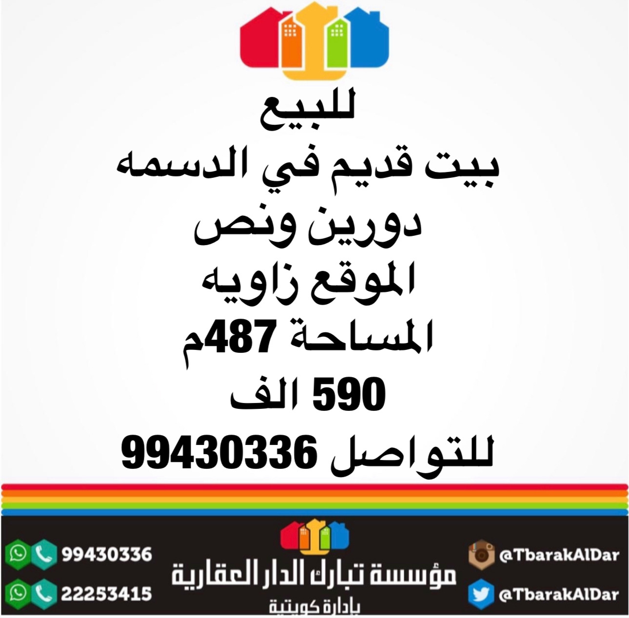 للبيع بيت فى الدسمة قديم ، يتكون من دورين ونص ، يقع على زاوية مقابل مدرسة ، مساحتة 487 متر مربع ، السعر 590 ألف دينار .