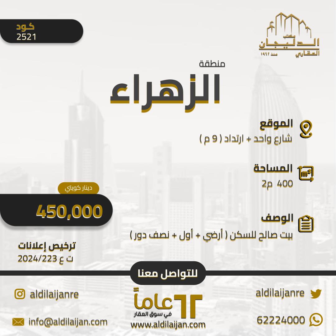 للبيع بيت فى الزهراء صالح للسكن Share ملخص للبيع بيت صالح للسكن فى الزهراء ، مساحته 400 متر مربع ، يقع على شارع واحد ، ارتداد 9 متر ، كود 2521 ، مراجعة 450,000 د.ك التفاصيل حالة: للبيع Page Views الأماكن القريبة من جوجل خصائص ذات صلة للبيع تجربة عنصر للبيع abdulrahman منذ 3 أسابيع للبيع د.ك111111 شقة تجربة عقار جديد خليل بوست أسرة: 666666 الحمامات: 666666 admin منذ 4 أسابيع Close