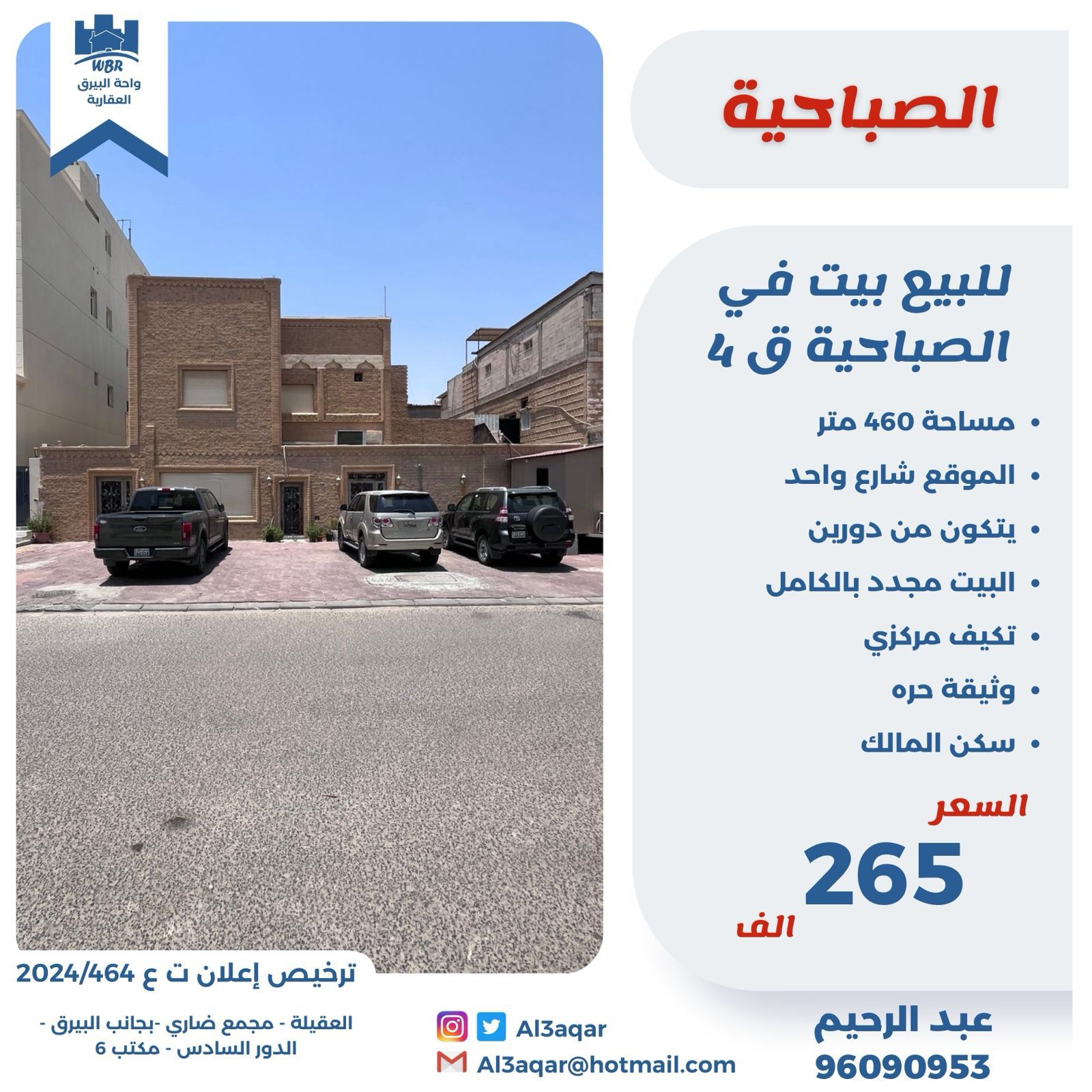 للبيع بيت فى الصباحية قطعة 4 سكن المالك Share ملخص للبيع بيت فى الصباحية قطعة 4 ، مساحته 460 متر مربع ، يقع على شارع واحد ، يتكون من دورين ، يوجد تكييف مركزي و الوثيقة حره ، سكن المالك ، السعر 265 ألف د.ك . التفاصيل حالة: للبيع Page Views الأماكن القريبة من جوجل خصائص ذات صلة للبيع تجربة عنصر للبيع abdulrahman منذ 4 أسابيع للبيع للبيع أرض فى صباح الاحمد البحريه واجهة شمالية admin منذ شهرين Close