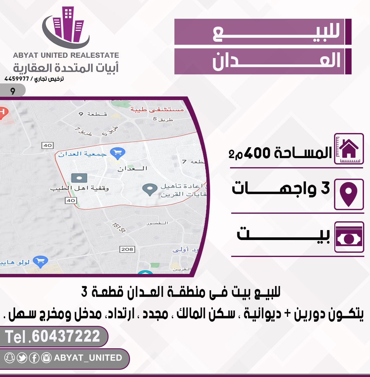 للبيع بيت فى منطقة العدان قطعة 3 , الموقع 3 واجهات ، المساحة 400 متر مربع ، يتكون من دورين ، ديوانية ، سكن المالك ، مجدد ، ارتداد ، مدخل ومخرج سهل ، للاستفسار النقال 1 60437222