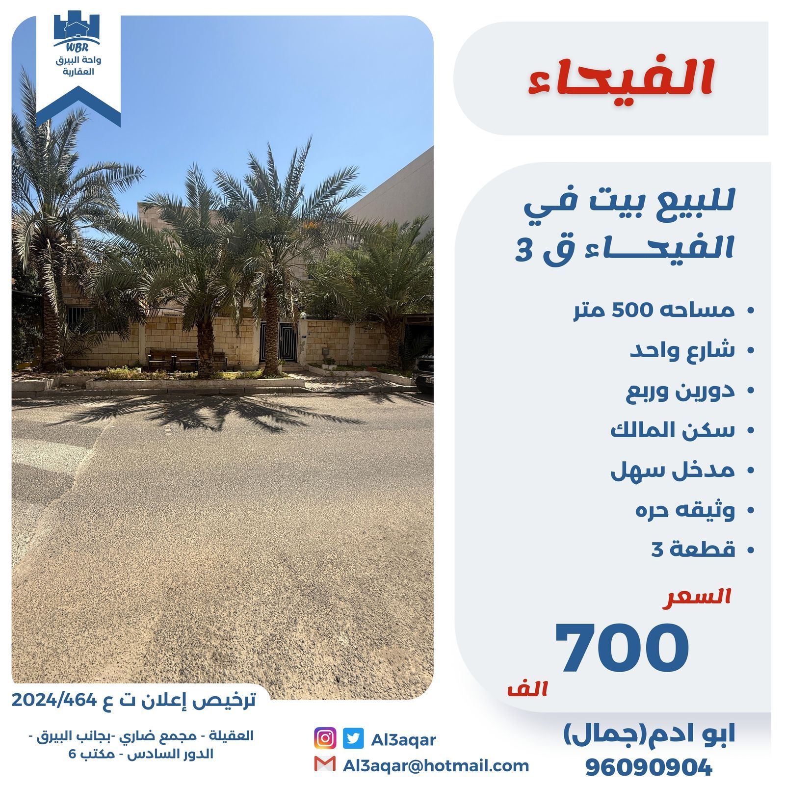 للبيع بيت فى الفيحاء قطعة 3 ، المساحة 500 متر مربع ، يقع على شارع واحد ، يتكون من دورين وربع ، سكن المالك ، مدخل سهل ، وثيقة حره ، السعر 700 ألف د.ك