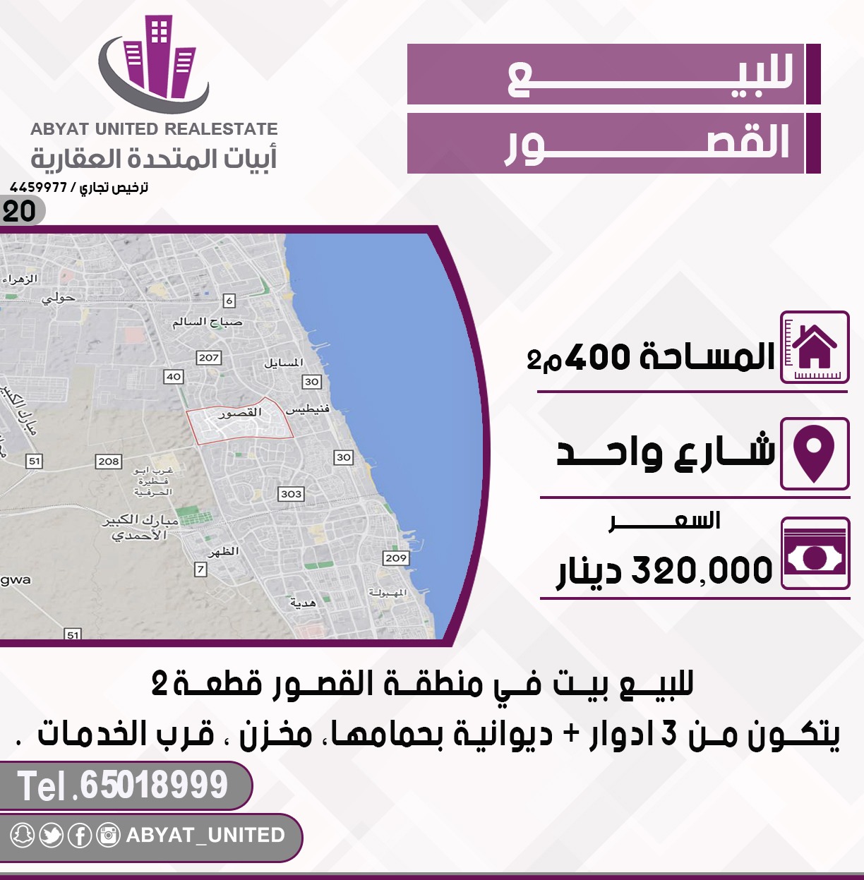 للبيع بيت فى القصور قطعه 2 Share ملخص للبيع بيت فى منطقة القصور قطعة 2 ، المساحة 400 متر مربع ، الموقع شارع واحد ، يتكون من 3 ادوار ، ديوانية بحمامها ، مخزن ، قرب الخدمات ، للاستفسار النقال 1 65018999 ، السعر 320 ألف د.ك ، كود 20 التفاصيل حالة: للبيع Page Views الأماكن القريبة من جوجل خصائص ذات صلة للبيع تجربة عنصر للبيع abdulrahman منذ 4 أسابيع للبيع أرضين متجاورتين للبيع فى مشرف admin منذ شهرين Close
