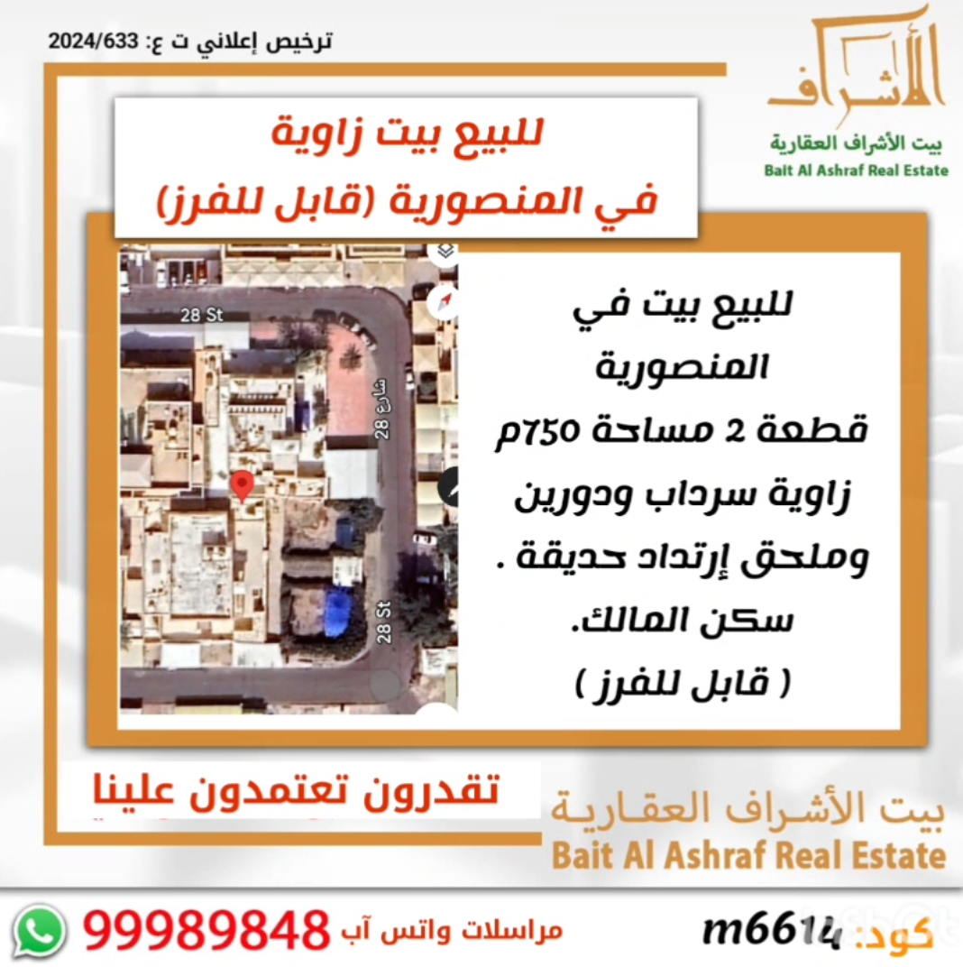 للبيع بيت فى المنصورية قطعة 2 ، مساحته 750 متر مربع ، يقع على زاوية ، يتكون من سرداب ودورين وملحق إرتداد حديقة ، البيت سكن المالك. ، قابل للفرز ، السعر مليون و 200 ألف د.ك