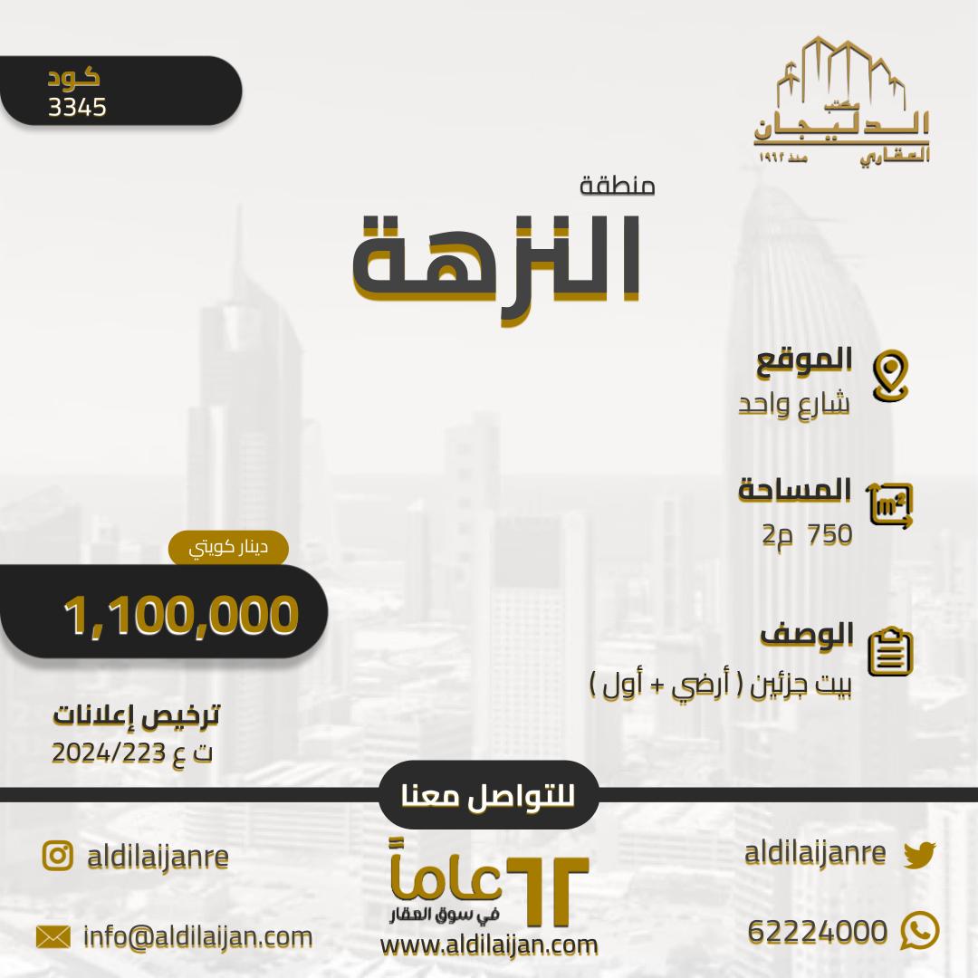 للبيع بيت فى النزهه ، جزئين ، أرضي ، أول ، مساحته 750 متر مربع ، يقع على شارع واحد ، كود 3345 ، مراجعة 1,100,000 د.ك