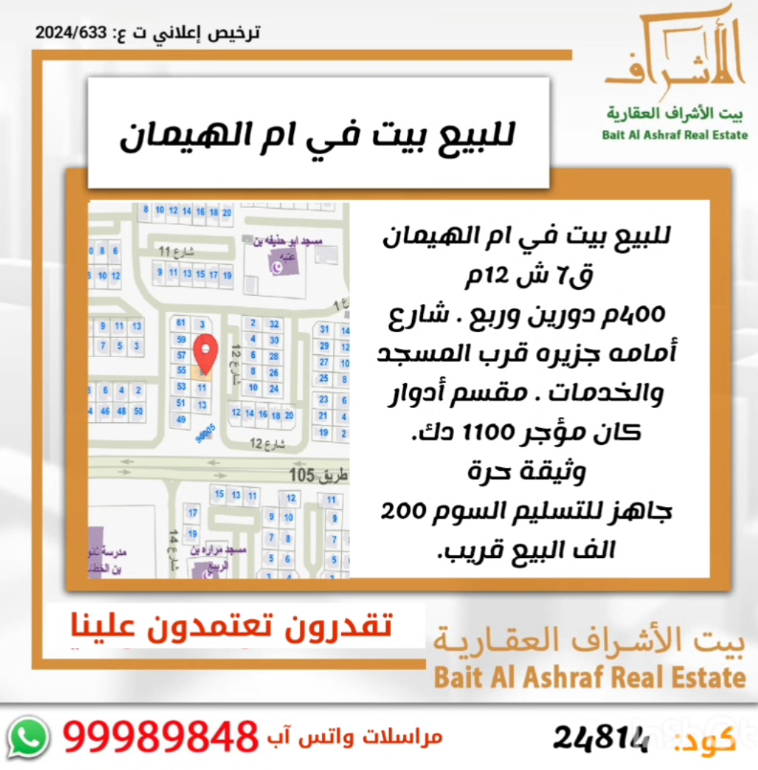 للبيع بيت فى ام الهيمان قطعة 7 شارع 12 ، مساحتها 400 متر مربع ، يتكون من دورين وربع ، يقع على شارع أمامه جزيره قرب المسجد والخدمات ، مقسم أدوار كان مؤجر بسعر 1100 دك ، يوجد وثيقة حرة ، جاهز للتسليم السوم 200 ألف د.ك البيع قريب.