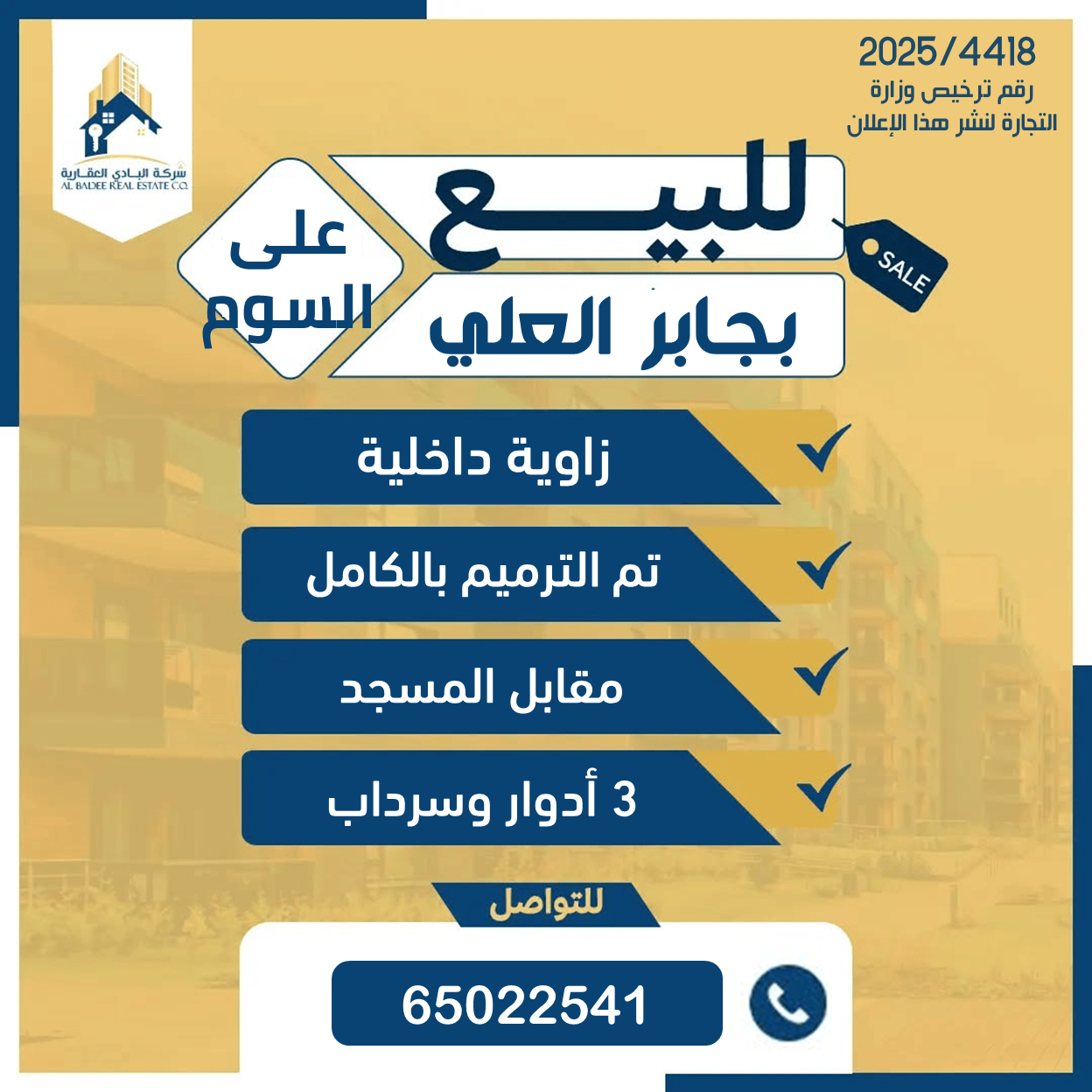للبيع بيت فى جابر العلي ، يقع على زاوية داخلية مقابل المسجد مع ارتداد ، تم الترميم الكامل وإعادة التقسيم ، البيت عبارة عن السرداب بمدخلين يتكون من 3 غرف و 2 حمام و صالة و مطبخ ، الأرضي عبارة عن 3 غرف و 3 حمامات و غرف خادمة و صالتين ، الأول عبارة عن 6 غرف و 3 حمام و صالة ، الثاني عبارة عن غرفة و حمام .