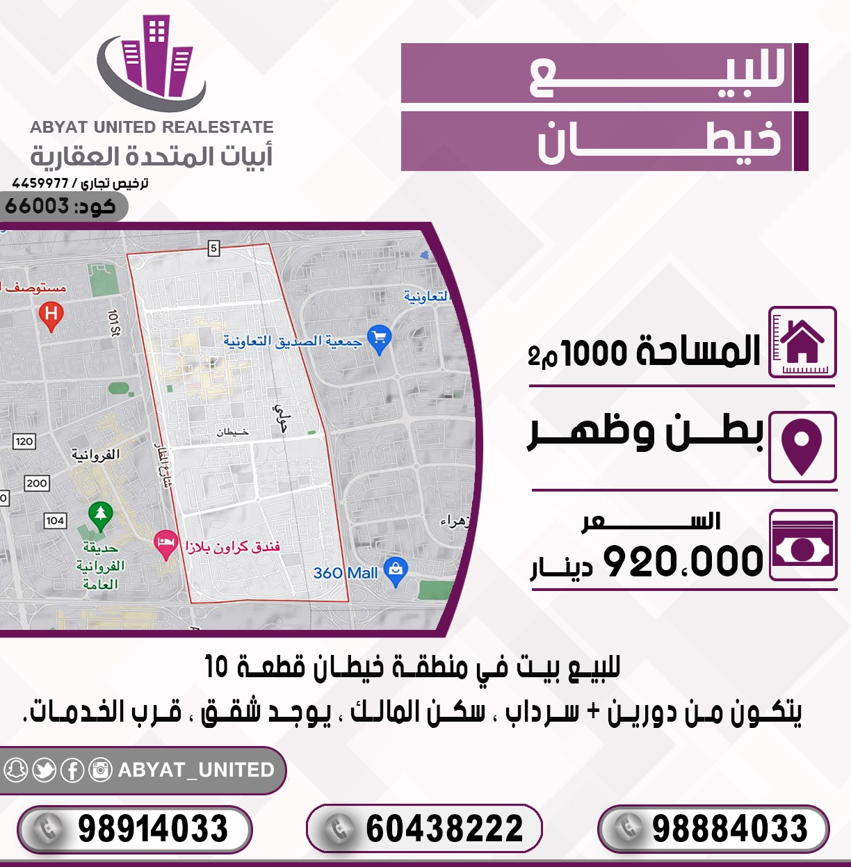 للبيع بيت فى منطقة خيطان ، قطعه 10 ، الموقع بطن وظهر ، المساحة 1000 متر مربع ، يتكون من دورين ، سرداب ، سكن المالك ، يوجد شقق ، قرب الخدمات ،