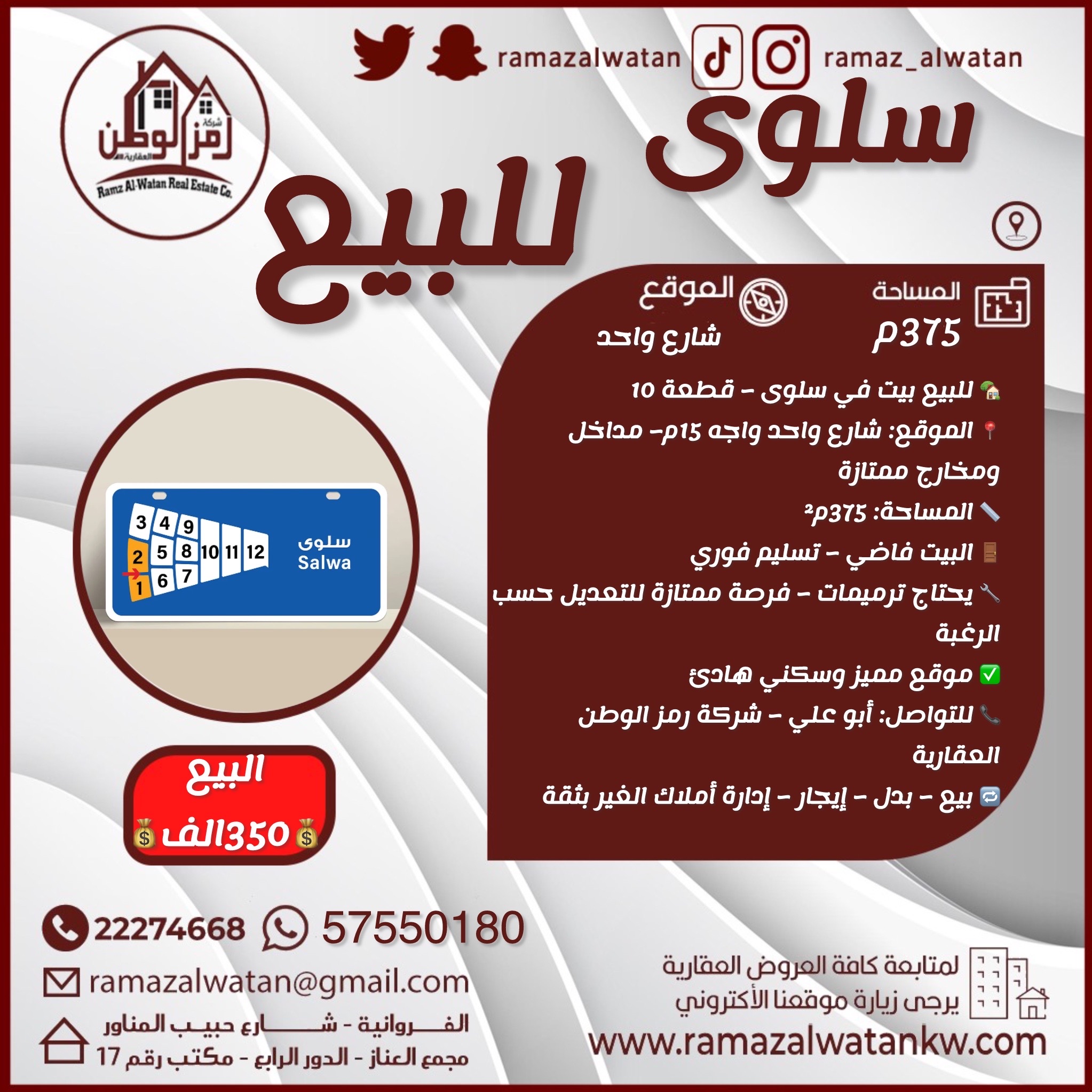 للبيع بيت فى سلوى ، قطعة 10 ، الموقع شارع واحد ، واجه 15 متر ، مداخل ومخارج ممتازة ، المساحة 375 متر مربع ،