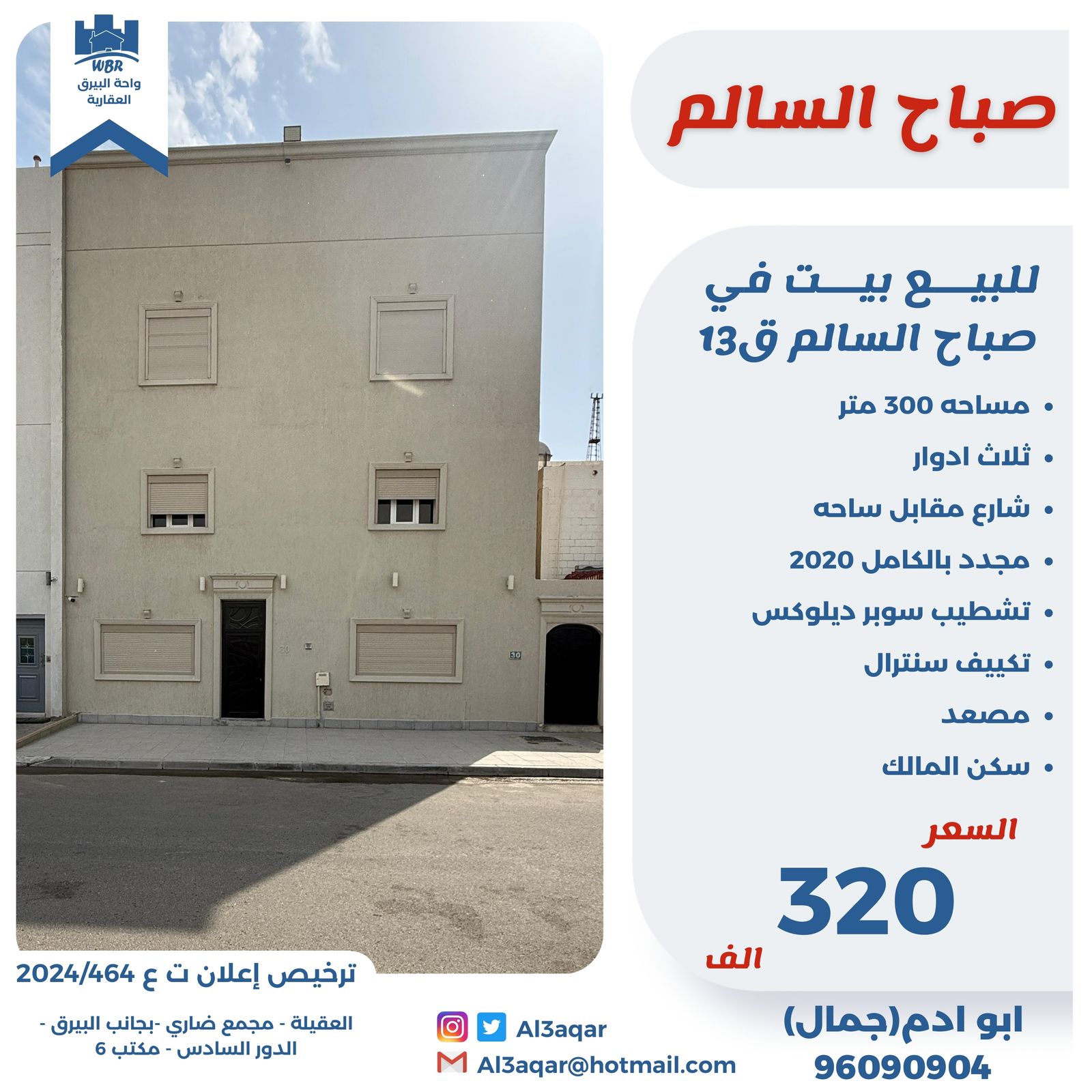 للبيع بيت فى صباح السالم ، قطعه 13 ، يتكون من ثلاث ادوار ، يقع على شارع مقابل ساحه ، مجدد بالكامل 2020 ، تشطيب سوبر ديلوكس ، تكييف سنترال ، مصعد ، المساحه 300 متر مربع ، سكن المالك ، السعر 320 ألف د.ك