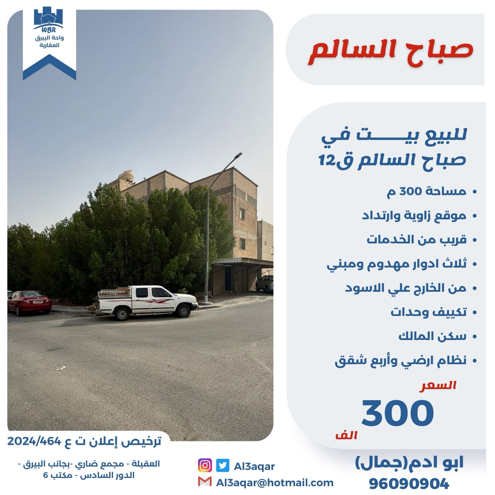 للبيع بيت فى صباح السالم قطعه 12 ، مساحته 300 متر مربع ، تقع على زاوية وارتداد قريب من الخدمات ، تتكون من ثلاث أدوار مهدوم ومبني من الخارج على الاسود ، يوجد تكييف وحدات ، سكن المالك ، نظام ارضي وأربع شقق السعر 300 ألف دينار .
