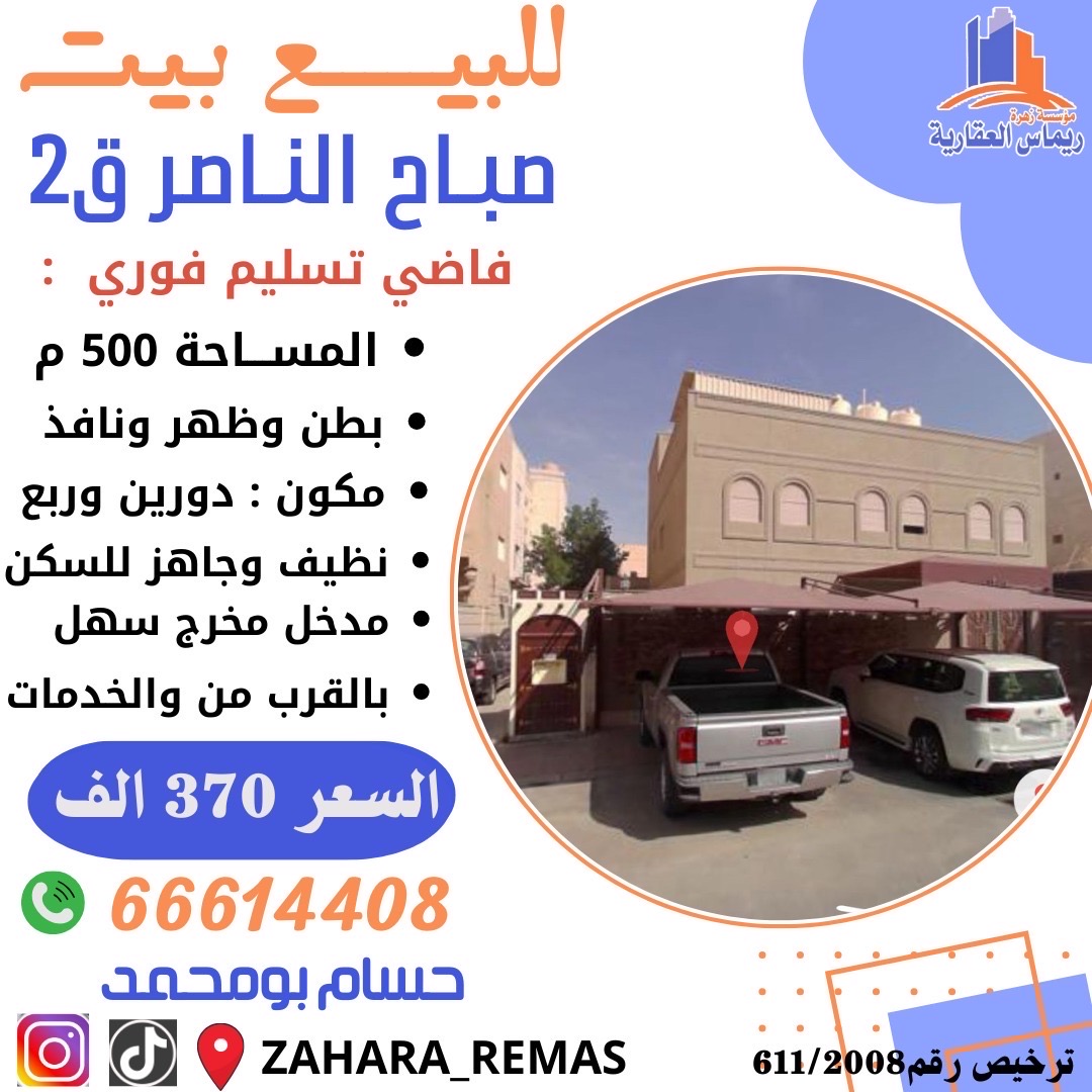 للبيع بيت فى صباح الناصر ، مساحته 500 متر مربع ، موقع بطن وظهر وسكة جانبية ، مدخل ومخرج سهل ، يتكون من دورين ونصف، البيت نظيف وجاهز للسكن ، وثيقة حرة ، فاضي للتسليم الفوري ، السعر 370,000 ألف دينار .
