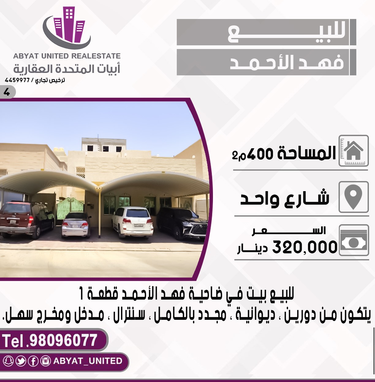 للبيع بيت فى ضاحية فهد الاحمد قطعة 1 ، يقع على شارع واحد ، مساحته 400 متر مربع ،يتكون من دورين ، ديوانية ، مجدد بالكامل ، سنترال، مدخل ومخرج سهل .