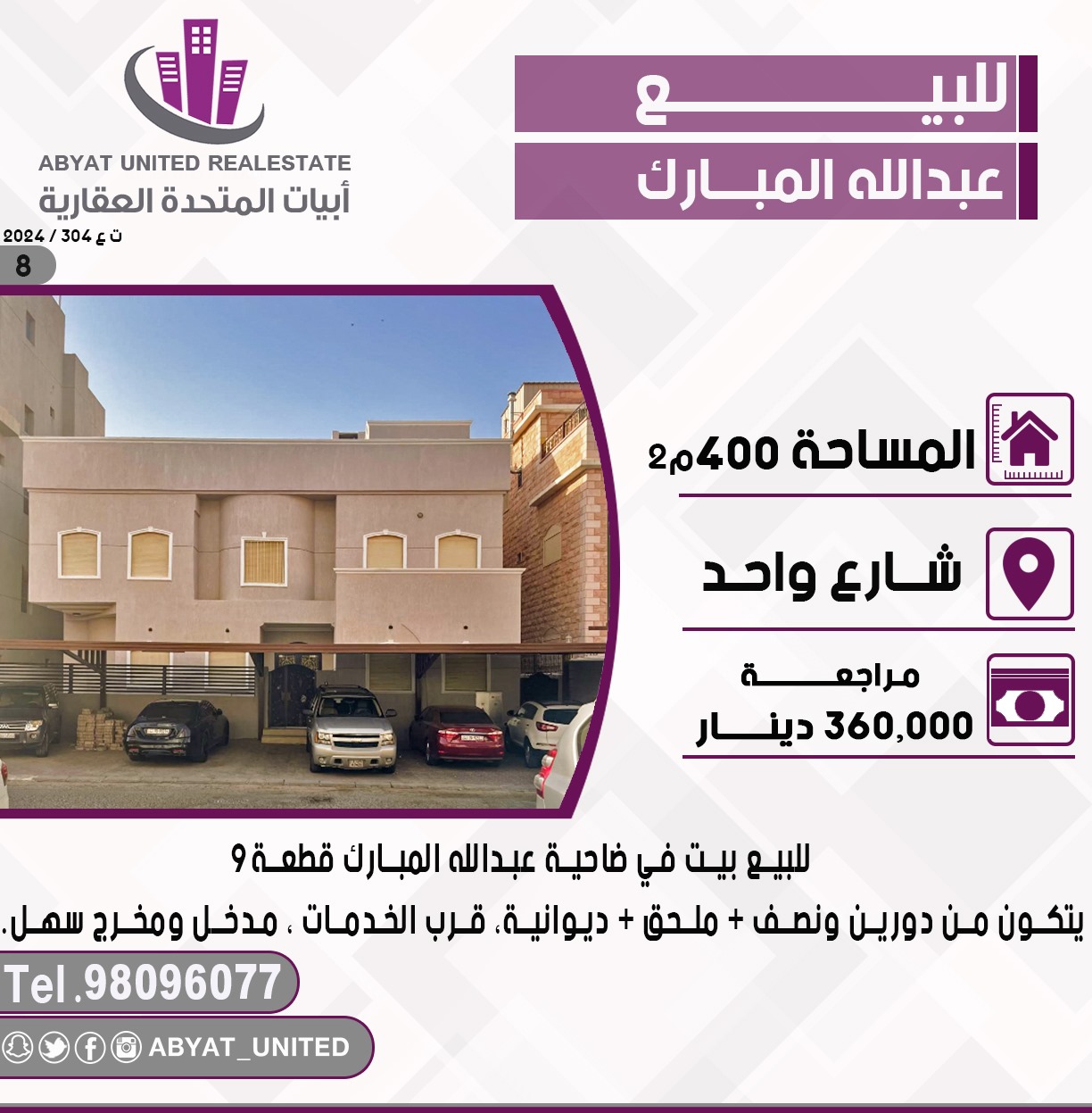 للبيع بيت فى عبدالله المبارك Share ملخص للبيع بيت فى ضاحية عبدالله المبارك ، قطعة 9 ، الموقع شارع واحد ، المساحة 400 متر مربع ، يتكون من دورين ونصف ، ملحق ، ديوانية ، قرب الخدمات ، مدخل ومخرج سهل ، للاستفسار النقال 1 98096077 ، السعر 360 ألف د.ك التفاصيل Page Views الأماكن القريبة من جوجل Close