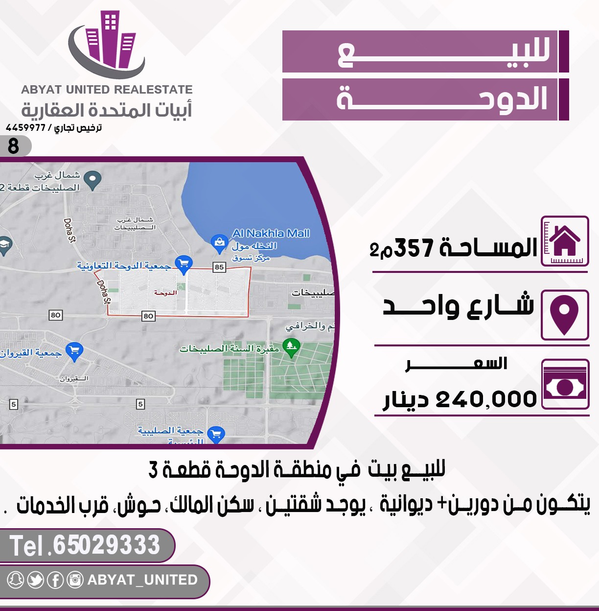 للبيع بيت فى منطقة الدوحة Share ملخص للبيع بيت فى منطقة الدوحة ، قطعة 3 ، الموقع شارع واحد ، المساحة 357 متر مربع ، يتكون من دورين ، ديوانية ، سكن المالك ، حوش ، قرب الخدمات ، للاستفسار النقال 1 65029333 ، السعر 240 ألف د.ك ، كود ، 8 التفاصيل Page Views الأماكن القريبة من جوجل Close