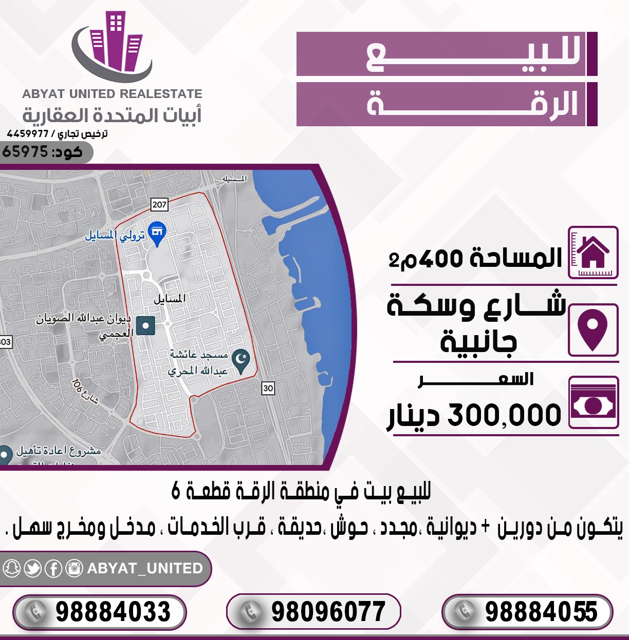 للبيع بيت فى منطقة الرقة قطعة 6 تقع على شارع وسكة جانبية ، مساحته 400 متر مربع ، يتكون من دورين ، ديوانية ، مجدد ، حوش ، حديقة ، قرب الخدمات، مدخل ومخرج سهل .