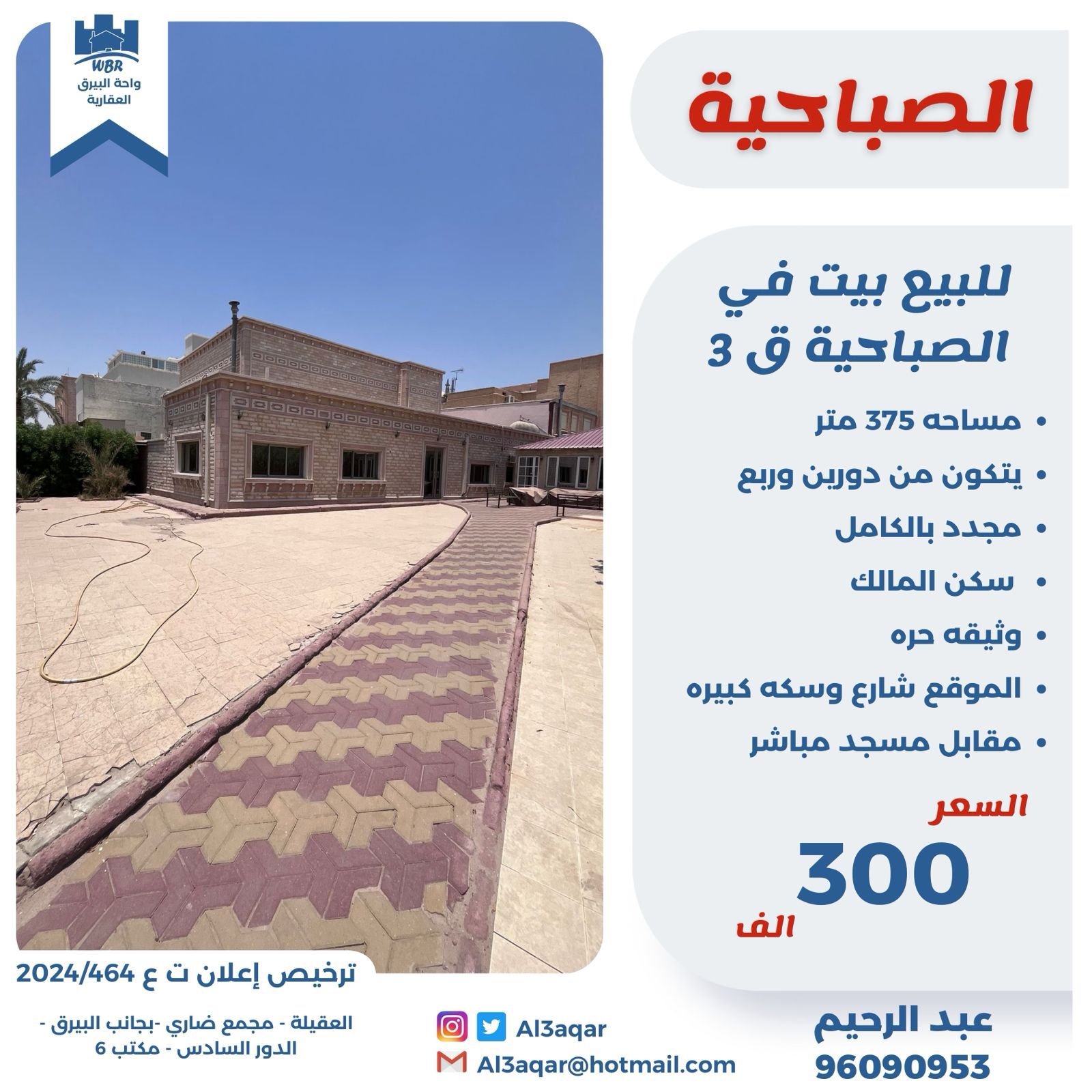 للبيع بيت فى منطقة الصباحية سكن المالك Share ملخص للبيع بيت فى الصباحية قطعة 3 ، مساحته 375 متر مربع ، يقع على شارع وسكة كبيره مقابل مسجد مباشرة ، يتكون من دورين وربع مجدد بالكامل ، سكن المالك ، الوثيقة حره ، السعر 300 ألف د.ك . التفاصيل حالة: للبيع Page Views الأماكن القريبة من جوجل خصائص ذات صلة للبيع تجربة عنصر للبيع abdulrahman منذ 4 أسابيع للبيع للبيع أرض بالخيران السكني قطعة 7 admin منذ شهرين Close