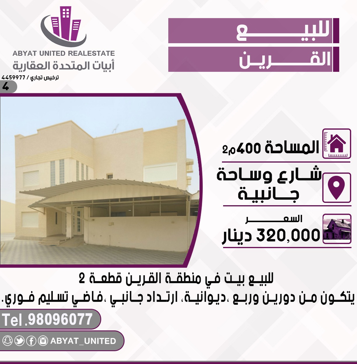 للبيع بيت فى منطقة القرين قطعة 2 ، تقع على شارع وساحة جانبيه ، مساحته 400 متر مربع ، يتكون من دورين وربع ، ديوانيه ، ارتداد خلفي ، فاضي ، تسليم فوري .