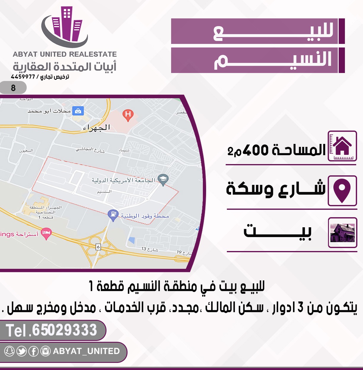 للبيع بيت فى منطقة النسيم قطعة 1 Share ملخص للبيع بيت فى منطقة النسيم قطعة 1 ، يقع على شارع وسكة ، مساحته 400 متر مربع ، يتكون من 3 أدوار ، سكن المالك ، مجدد ، قرب الخدمات ، مدخل ومخرج سهل . للاستفسار النقال1 65029333 التفاصيل حالة: للبيع Page Views الأماكن القريبة من جوجل خصائص ذات صلة للبيع تجربة عنصر للبيع abdulrahman منذ 3 أسابيع للبيع د.ك111111 شقة تجربة عقار جديد خليل بوست أسرة: 666666 الحمامات: 666666 admin منذ 4 أسابيع Close