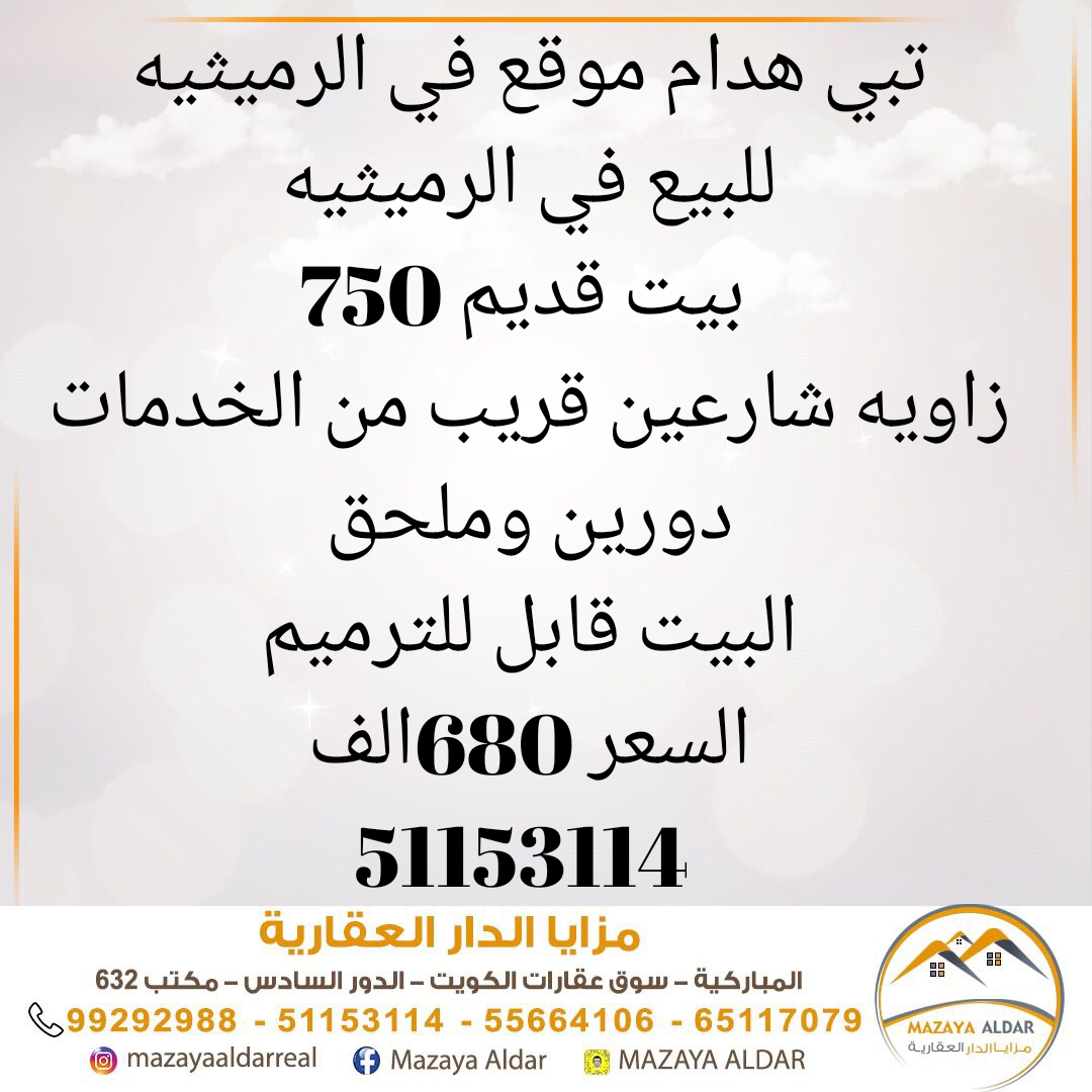 للبيع بيت قديم فى الرميثيه هدام ، مساحته 750 متر مربع ، يقع على زاوية شارعين قريب من الخدمات ، يتكون من دورين وملحق ، البيت قابل للترميم ، السعر 680 ألف د.ك .