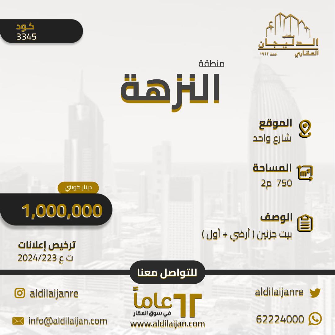 للبيع بيت قديم فى منطقة النزهة ، يقع على شارع واحد ، مساحته 750 متر مربع ، السعر مليون د.ك .