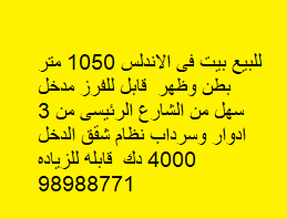 للبيع بيت مؤجر فى الاندلس Share ملخص للبيع بيت فى الاندلس ، مساحته 1050 متر مربع ، يقع على بطن وظهر ، قابل للفرز ، مدخل سهل من الشارع الرئيسى ، يتكون من 3 ادوار وسرداب ، نظام شقق ، الدخل 4000 د.ك ، قابله للزياده ، 98988771 التفاصيل حالة: للبيع Page Views الأماكن القريبة من جوجل خصائص ذات صلة للبيع تجربة عنصر للبيع abdulrahman منذ 4 أسابيع للبيع بيت للبيع فى ابو فطيره أول ساكن admin منذ شهر واحد Close