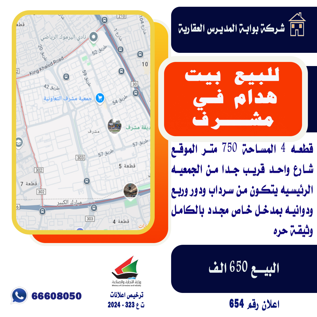 للبيع بيت هدام فى مشرف قطعة 4 ، مساحته 750 متر مربع ، يقع على شارع واحد قريب جدا من الجمعيه الرئيسيه يتكون من سرداب و دور و ربع و دوانيه بمدخل خاص مجدد بالكامل وثيقة حره البيع 650 ألف دينار يمنع الوسطاء شركة بوابة المديرس العقارية اعلان رقم 654
