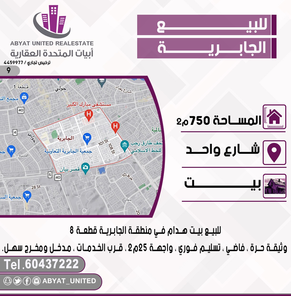 للبيع بيت هدام فى الجابريه Share ملخص للبيع بيت هدام فى منطقة الجابرية ، قطعة 8 , الموقع شارع واحد ، المساحة 75 متر مربع ، وثيقة حرة ، فاضي ، تسليم فوري ، واجهة 25 متر ، قرب الخدمات ، مدخل ومخرج سهل ، للاستفسار النقال 1 60437222 التفاصيل حالة: للبيع Page Views الأماكن القريبة من جوجل خصائص ذات صلة للبيع تجربة عنصر للبيع abdulrahman منذ 3 أسابيع للبيع بيت حكومي للبيع فى الفردوس قطعة 3 admin منذ شهر واحد Close