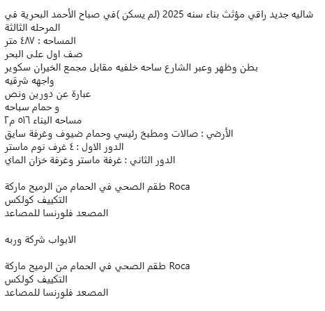 للبيع شاليه جديد فى مدينة صباح البحرية ، المرحلة الثالثة ، بلوك سي ، مساحة487 متر مربع ، يقع على بطن و ظهر على البحر مباشرة ، واجهة شرقية ، ارتداد خلفي ، لم يسكن بعد ، يتكون من دورين و نصف ، حمام سباحة ، مع الاثاث ، بسعر 450 ألف مراجعة , رقم الكود 7675 , "دروازة الصفاة العقارية " , للتواصل – 55572647 – 97116767 – ترخيص إعلانات رقم ت ع 161 / 2024