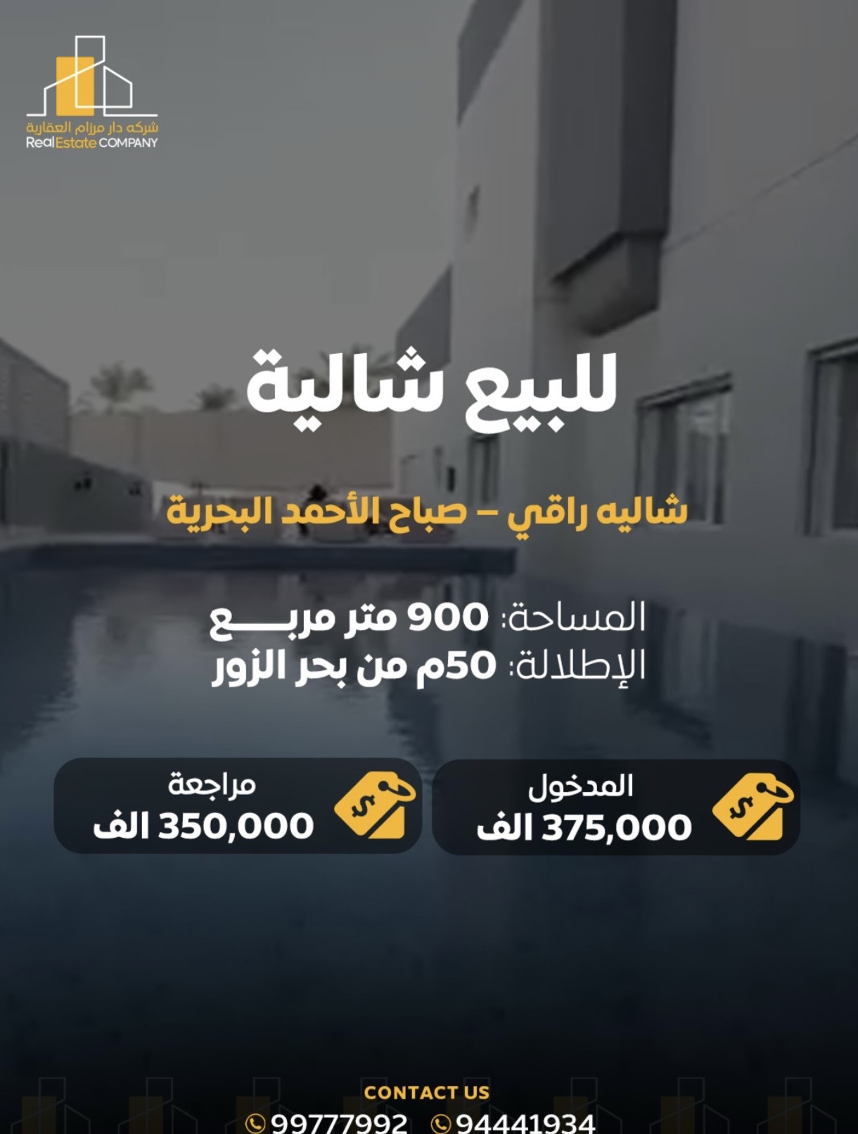 للبيع شاليه فى صباح الأحمد البحريه بالمرحله الثانيه ، مساحته 900 متر مربع ، يقع على بطن وظهر موقع صف ثاني من البحر ، يوجد فريه خاصه بالخلف مطله للبحر المفتوح تبعد 50 متر من بحر الزور .